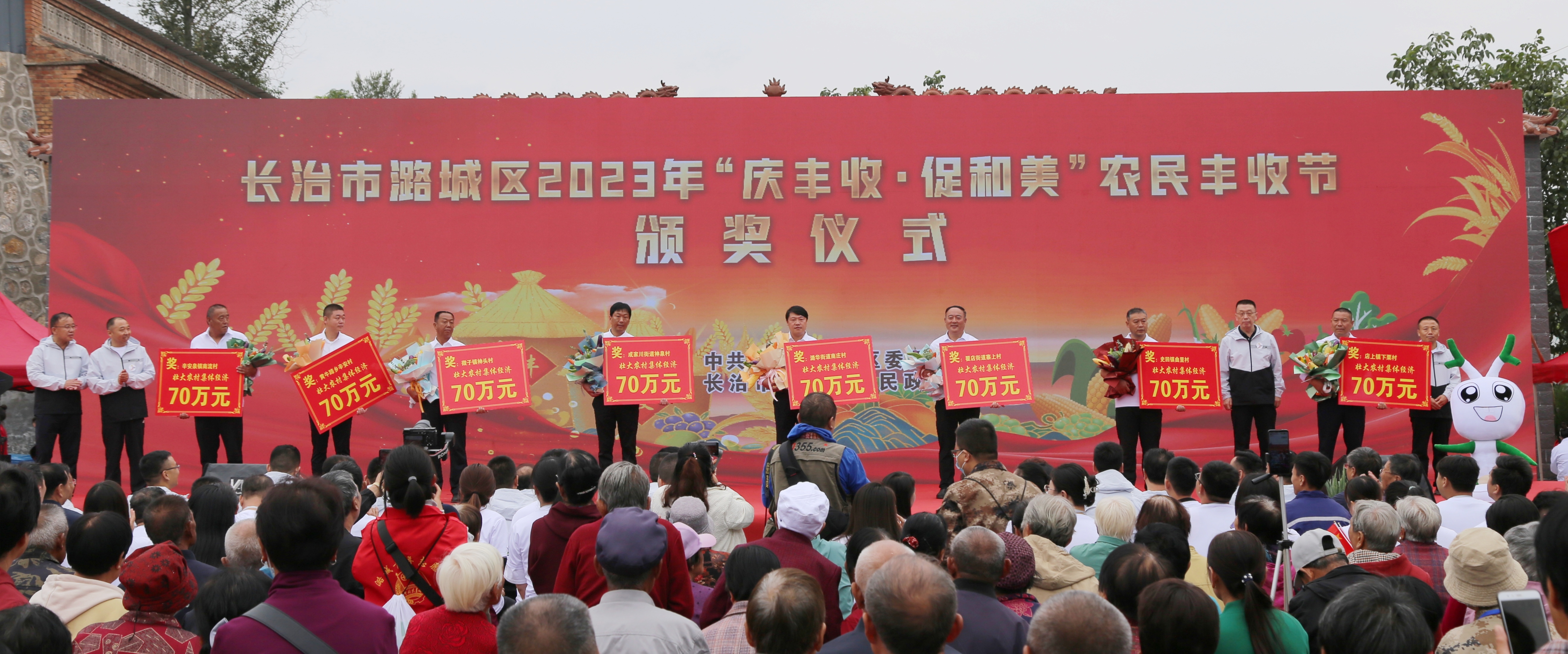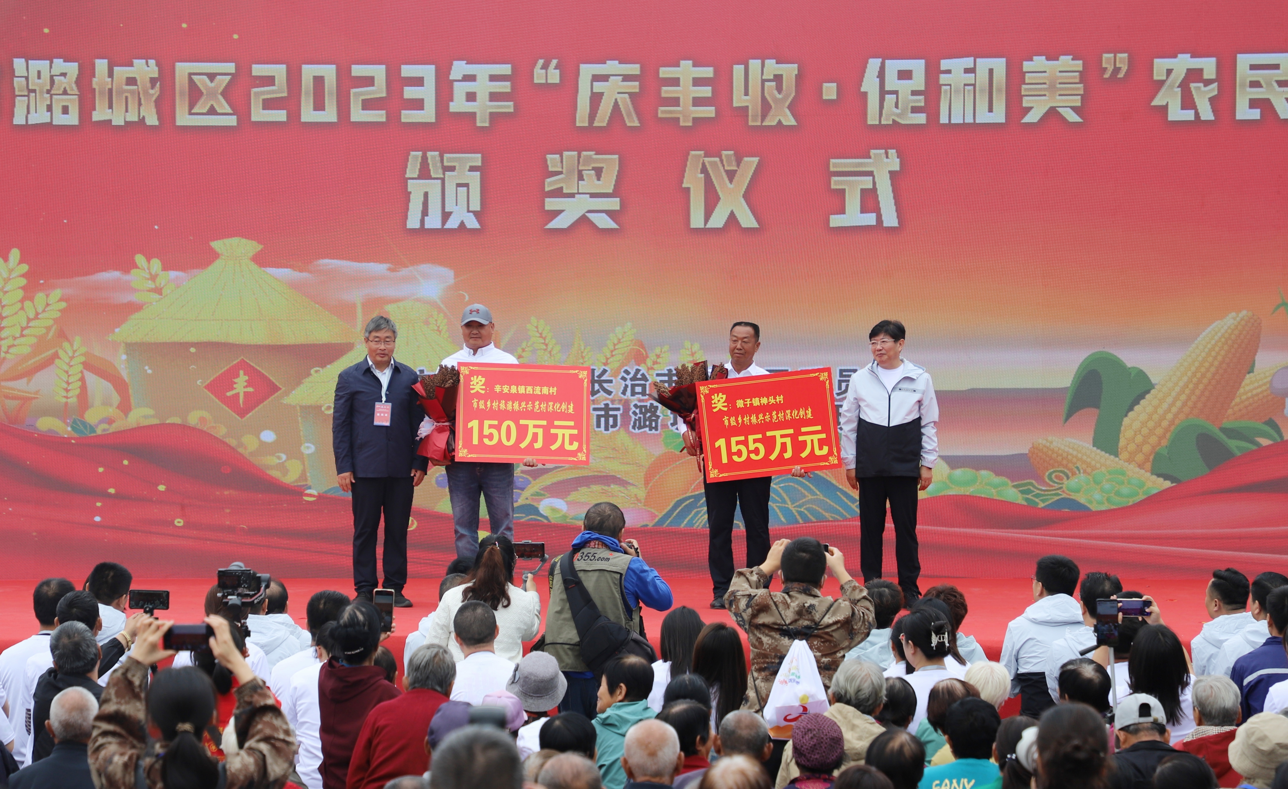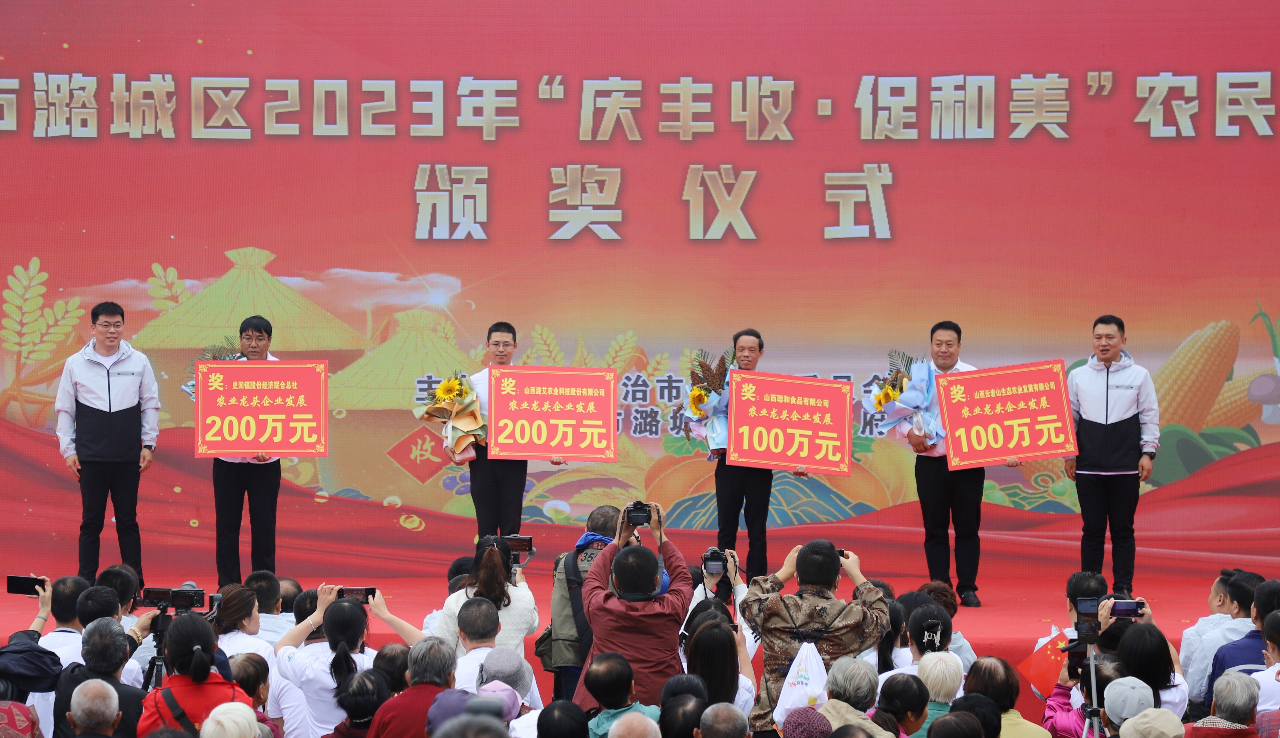 活动在喜庆的舞蹈中拉开帷幕,视频展播《丰收·潞城》和《书记话丰收》,全面展示了我区各乡镇(街道)特色农业产业的蓬勃发展和硕果累累的丰收景象。活动对荣获市级乡村振兴示范村深化创建奖的微子镇神头村和市级乡村旅游振兴示范村深化创建奖的辛安泉镇西流南村进行了表彰,并分别颁发155万元、150万元奖金;对荣获农业龙头企业发展奖的山西云岩山生态农业发展有限公司、山西聪和食品有限公司、山西潞艾农业科技股份有限公司等4家企业进行表彰,并分别予以100万元、200万元奖励;对荣获壮大集体经济奖的店上镇下栗村等8个村进行表彰,并分别颁发70万元奖励。