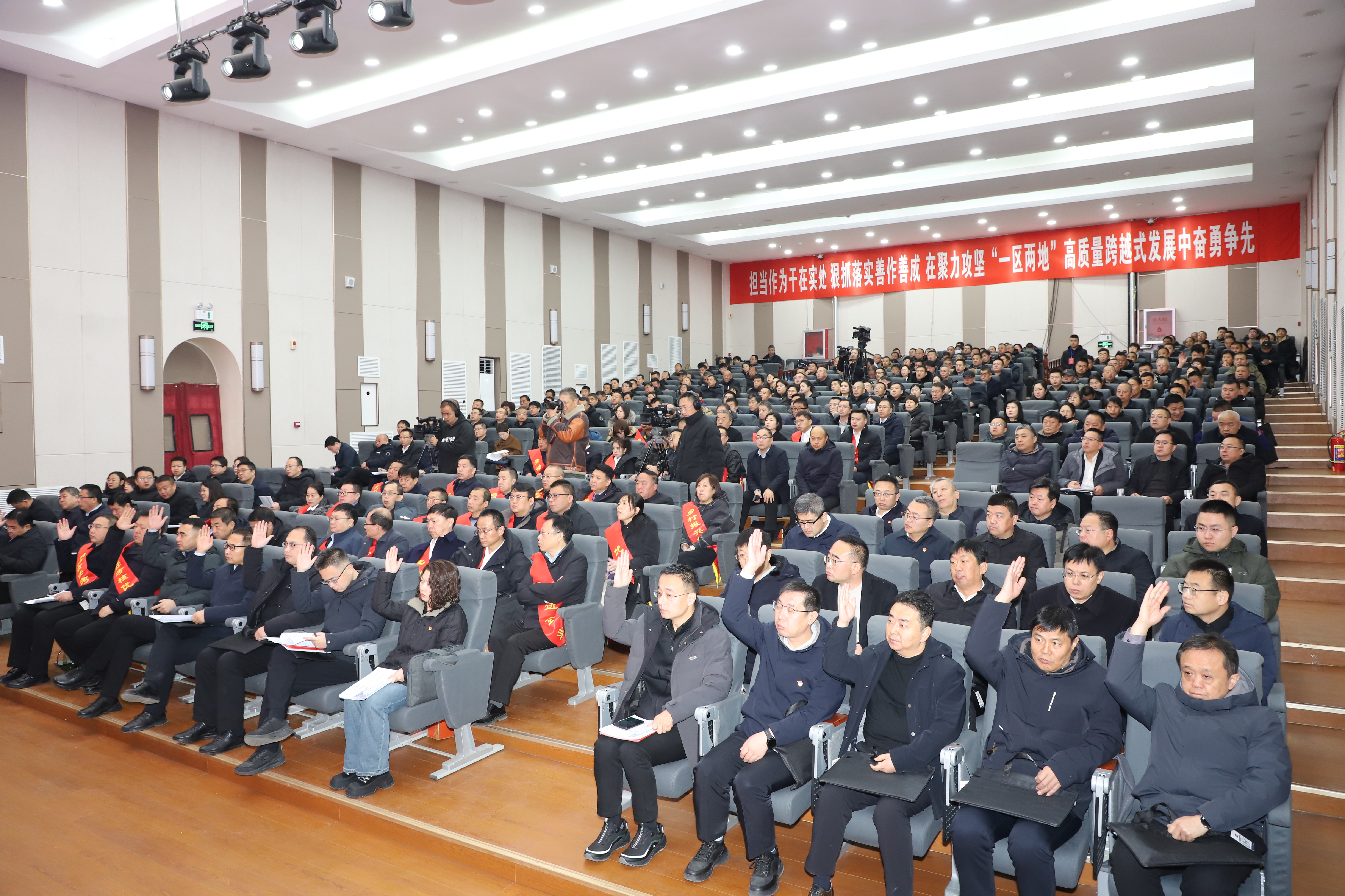 会场外,天气乍暖还寒,“向劳模学习”“向劳模致敬”的标语显眼醒目;会场内,气氛庄重热烈,后方悬挂条幅“担当作为干在实处 狠抓落实善作善成 在聚力攻坚‘一区两地’高质量跨越式发展中奋勇争先”激励人心、催人奋进。