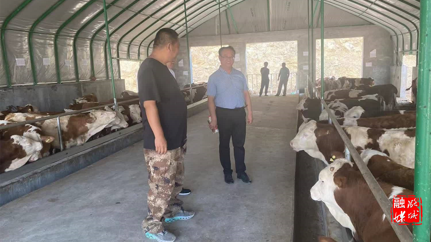 ▲微子镇相关负责人在李园村查看肉牛养殖项目运行情况。