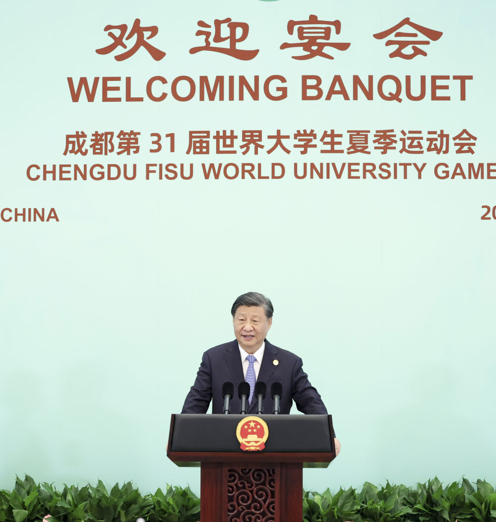 7月28日中午,国家主席习近平和夫人彭丽媛在四川省成都市金牛宾馆举行宴会,欢迎出席成都第31届世界大学生夏季运动会开幕式的国际贵宾。这是习近平发表致辞。新华社记者 丁海涛 摄