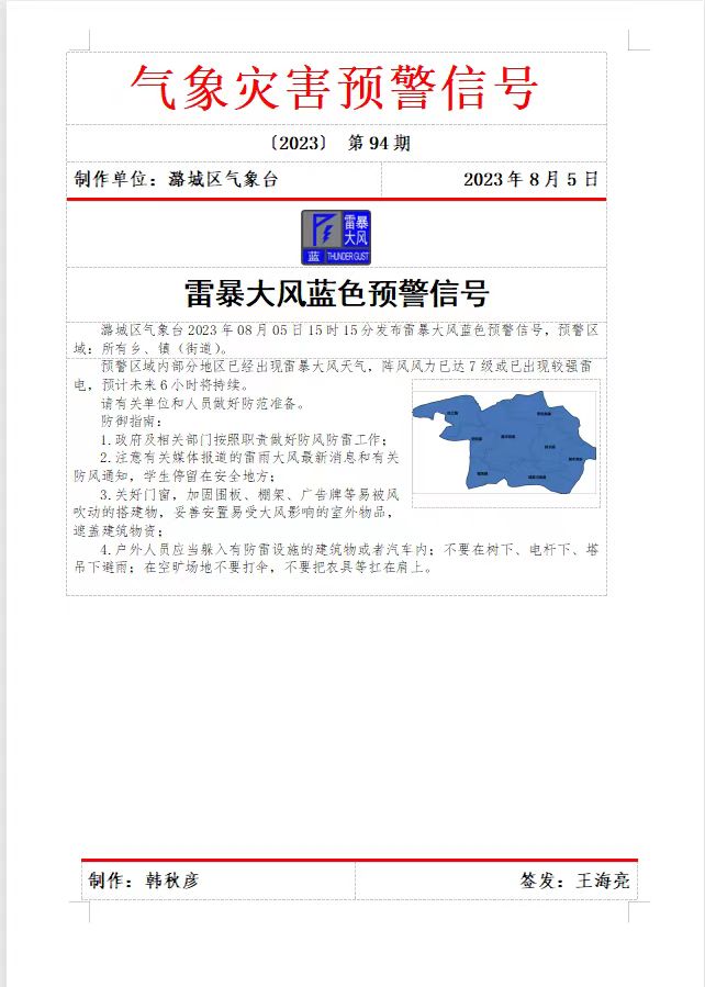 潞城区气象台2023年08月05日15时15分发布雷暴大风蓝色预警信号,预警区域:所有乡、镇(街道)。