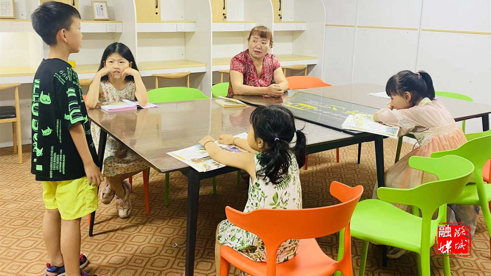 “我今天分享的故事是《画蛇添足》,楚国有个祭祀的官员,给手下办事的人一壶酒和酒具......”这位活泼开朗的小朋友自信的在课堂上讲着自己准备好的小故事,深深吸引着在场的每一个人。刘爱兰老师退休前是一名语文老师,在课堂上辅导小朋友们做暑假作业之余,还引导他们积极分享各自最喜爱的诗词、故事,一首首脍炙人口的诗词、一个个耳熟能详的故事、抑扬顿挫的诵读回荡在课堂上,培养他们养成爱读书、读好书、善读书的好习惯。刘老师说,“我现在退休在家闲着,正好咱们小区有个“红教鞭”课堂,有时间了就下来看看孩子们,辅导他们写作业,当孩子们在学习上遇到困难的时候帮助他们解决,这样使孩子们学到更多的知识,同时也充实了我自己。