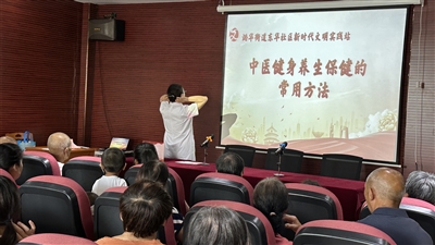 此外,东华社区特邀辖区卫生服务站医护人员来社区开展“中医健身养生保健常用方法”主题健康知识讲座。讲座中,医护人员介绍了穴位按摩中医养生方法,并示范如何正确找到相应的保健穴位。随后,陈氏太极协会成员向大家展示了太极扇和太极拳等太极项目,表演缓慢轻柔,动作行云流水,充分展现了太极运动的神韵之美。