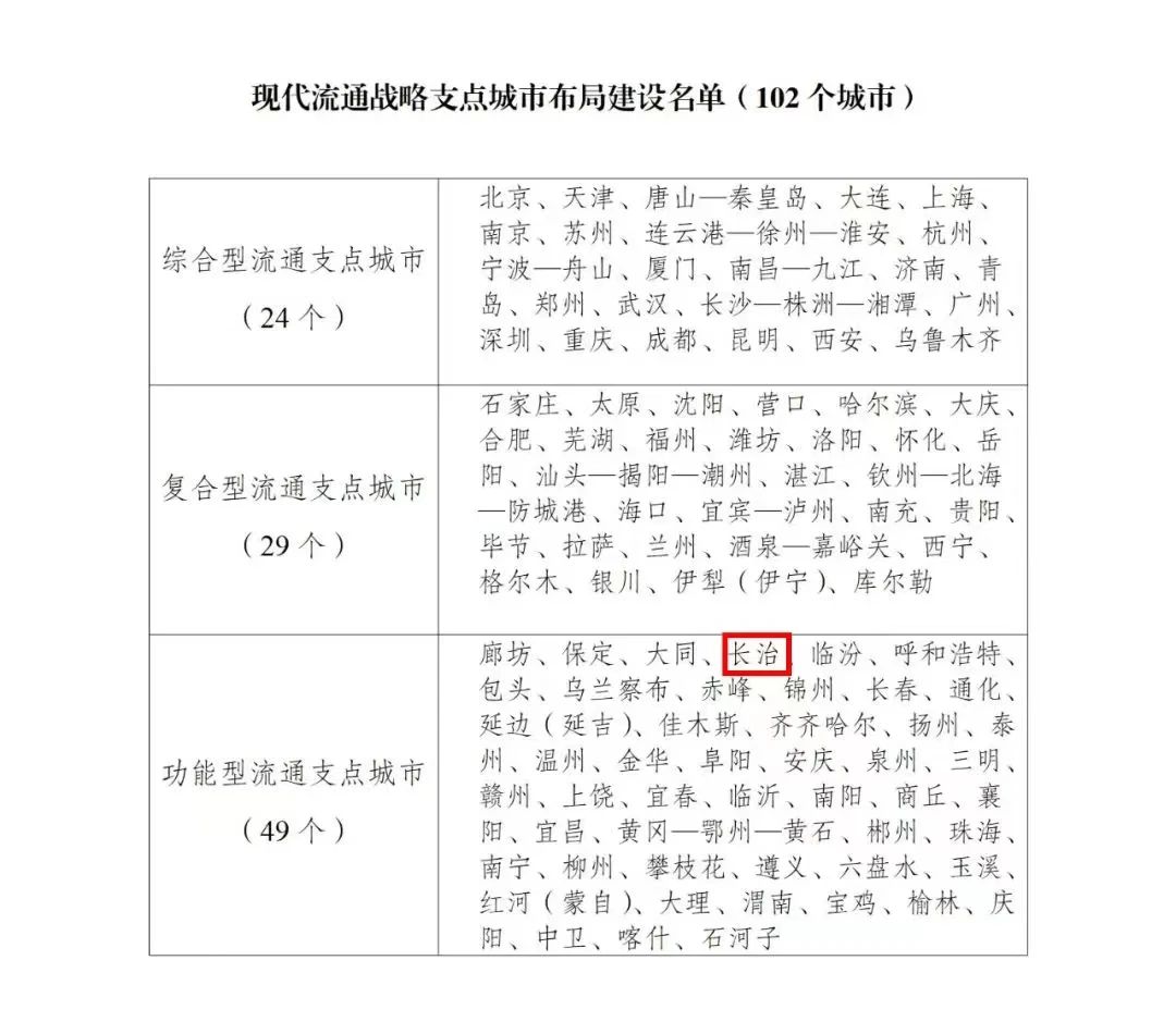 为贯彻党的二十大报告有关部署、落实《“十四五”现代流通体系建设规划》相关要求,推动构建高效顺畅的现代流通体系,近日,国家发展改革委会同自然资源部、交通运输部、商务部、市场监管总局印发《关于布局建设现代流通战略支点城市的通知》,部署现代流通战略支点城市布局建设工作。根据《通知》公布的名单,长治成功入选国家现代流通战略支点城市!