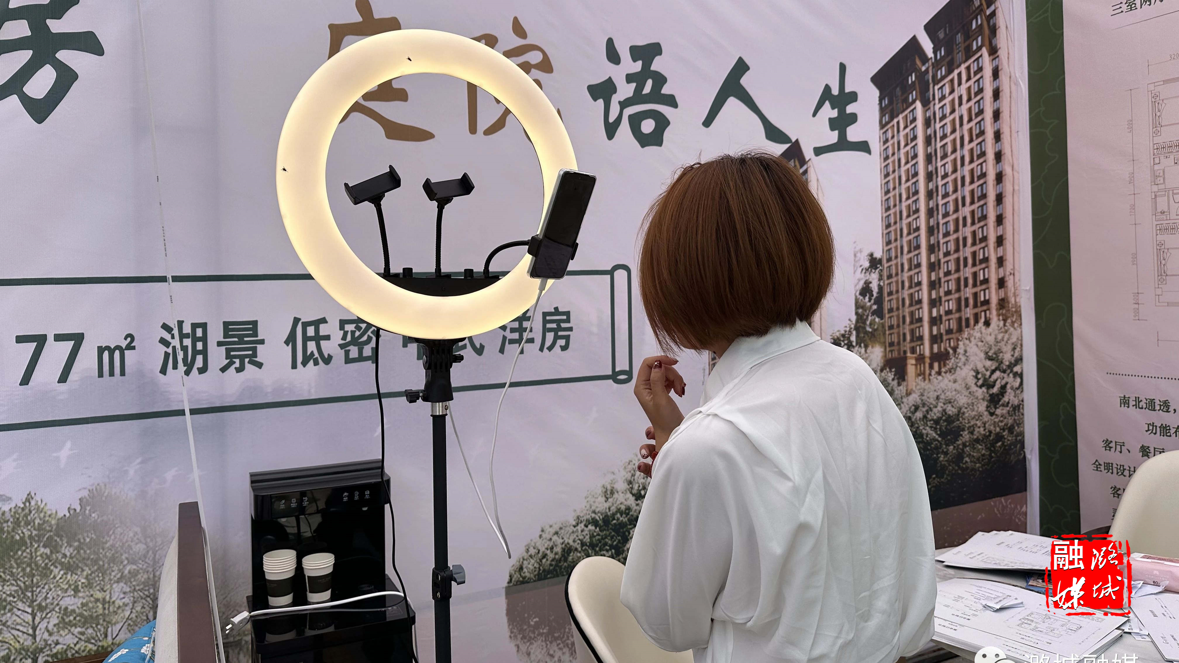 在另一旁的展区,记者还看到销售人员正在进行线上直播,通过这样的形式,为购房者提供一个更便捷、更高效、更智能的看房选房平台,搭建起了购房者与企业之间的桥梁。