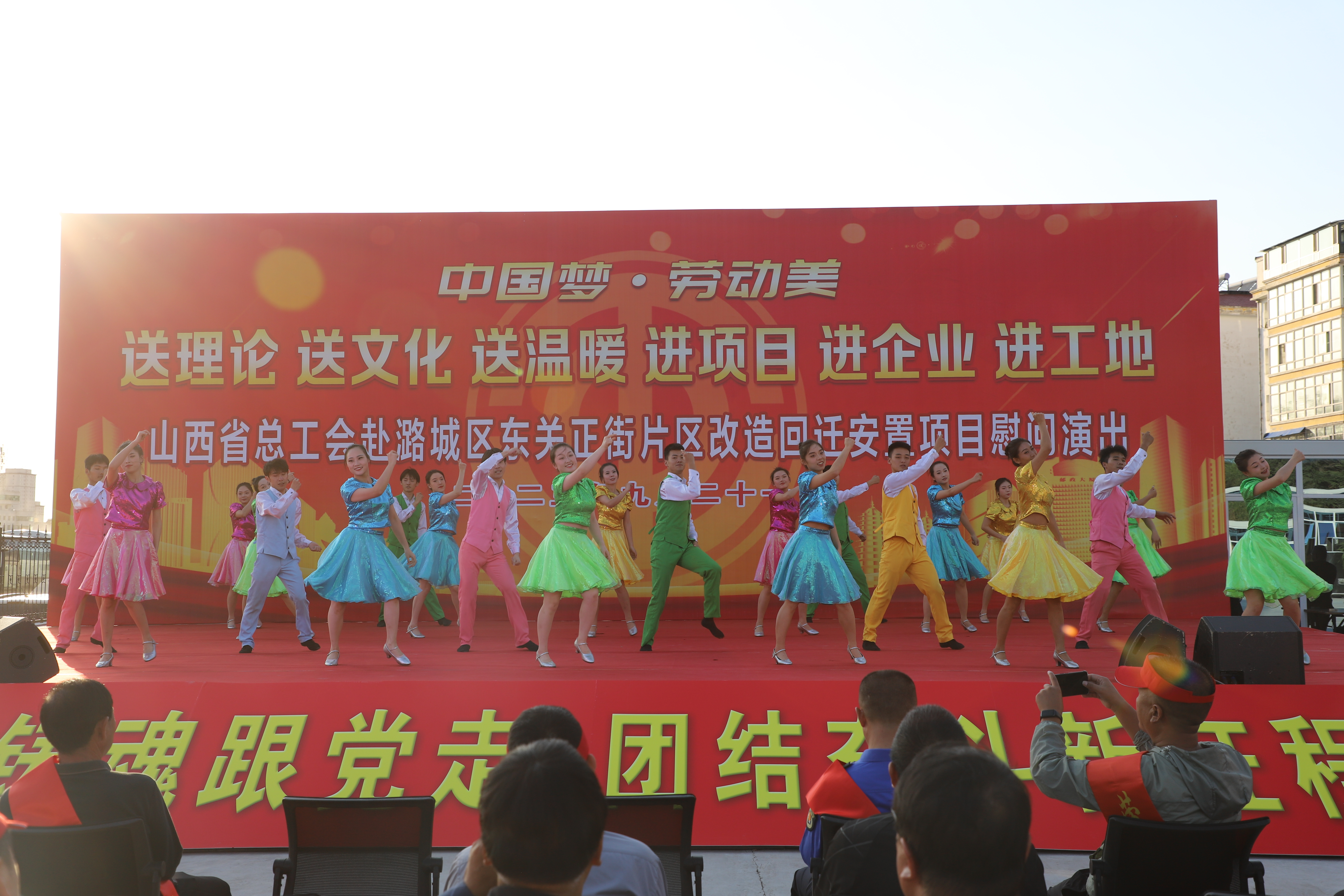 9月21日,省总工会“中国梦 劳动美”“三送三进”慰问演出活动在我区东关正街片区改造回迁安置项目精彩上演。区委书记段尧刚,省总工会宣教部副部长李晓萍,市总工会党组成员、副主席陈杰,区政协副主席、总工会主席靳忠玲和我区劳模代表及广大项目建设一线工作者一同观看演出。