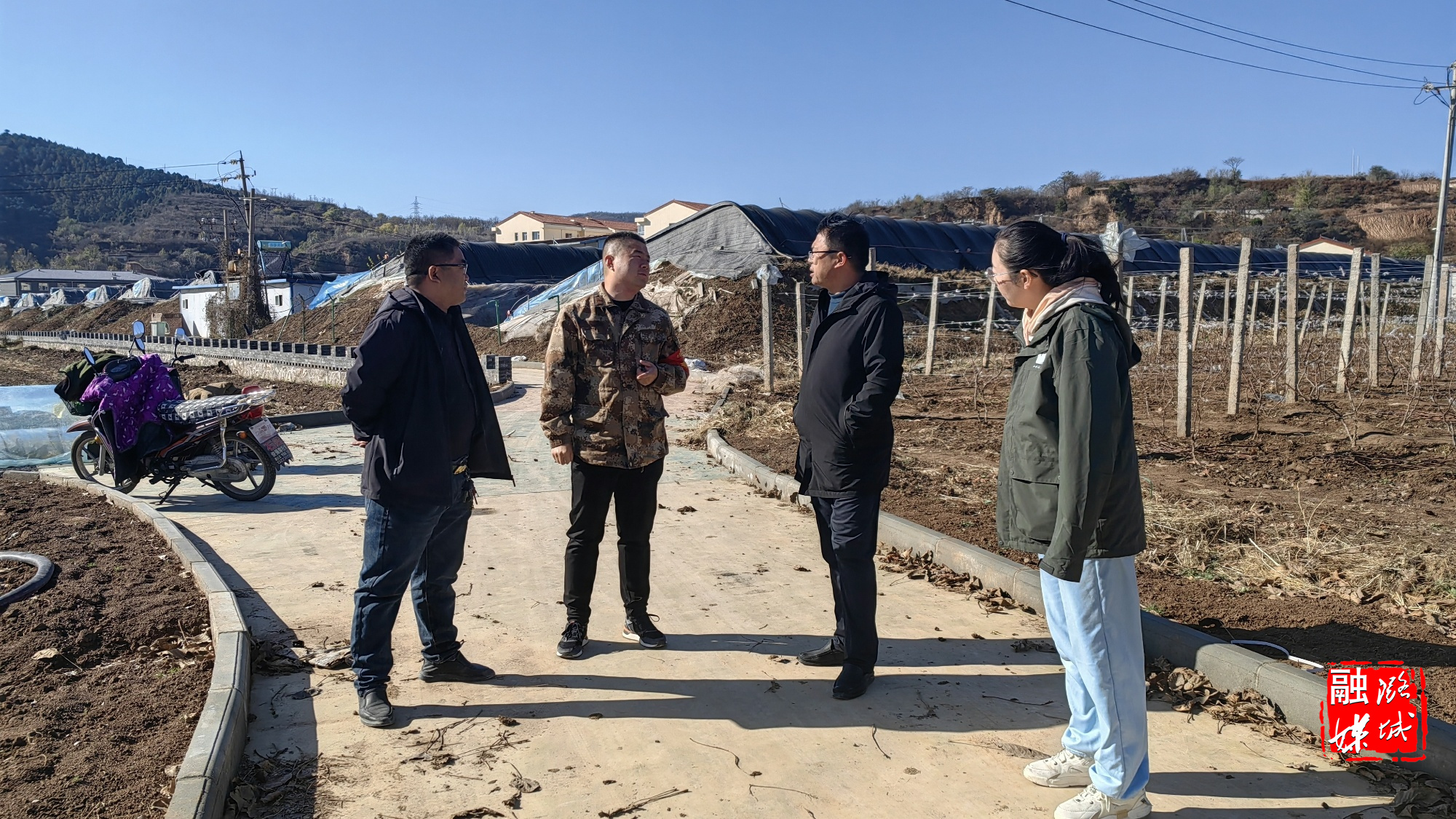 ▲辛安泉镇相关负责人在西流北村查看观光设施农业项目进展情况。