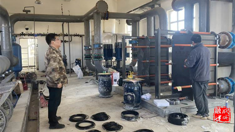 ★11月6日,微子镇相关负责人在王都庄村查看换热站调试和运行情况。