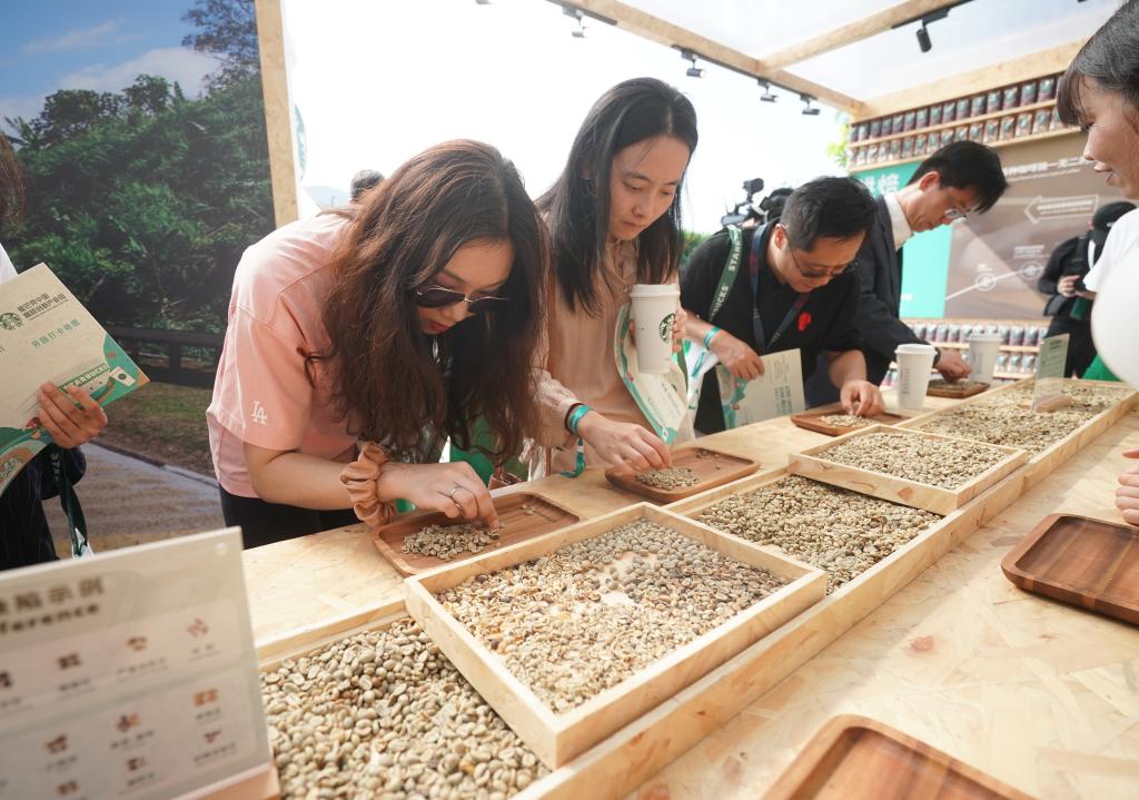 9月19日,在星巴克中国咖啡创新产业园开园仪式现场,来宾在体验挑拣咖啡生豆。当日,星巴克中国咖啡创新产业园在江苏昆山落成投产。