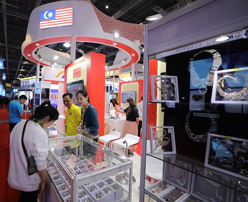 2023年11月6日,参观者在第六届进博会国家展马来西亚展台欣赏展出的珠宝首饰。
