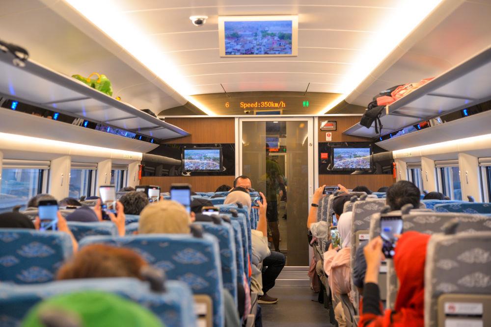 2023年11月5日,在行驶中的雅万高铁高速动车组列车车厢内,乘客纷纷用手机拍摄显示列车时速达到350公里的电子屏。