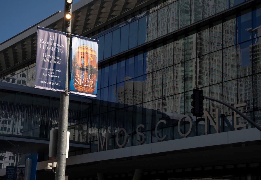 近日,美国旧金山亚太经合组织会议场地外的宣传海报。