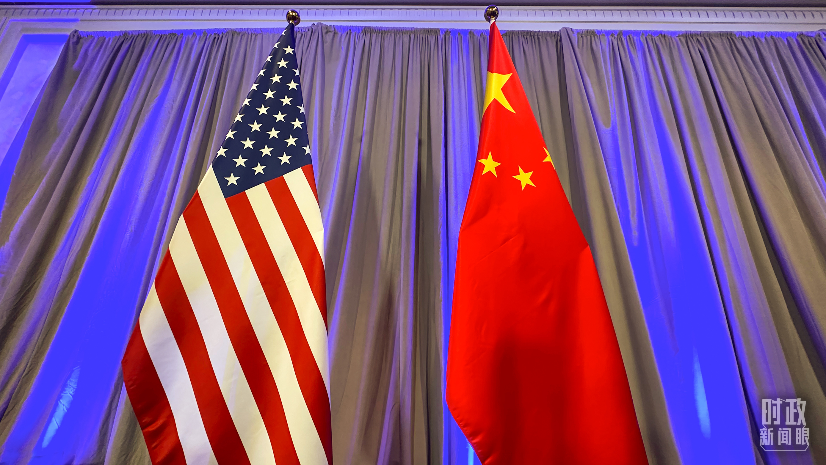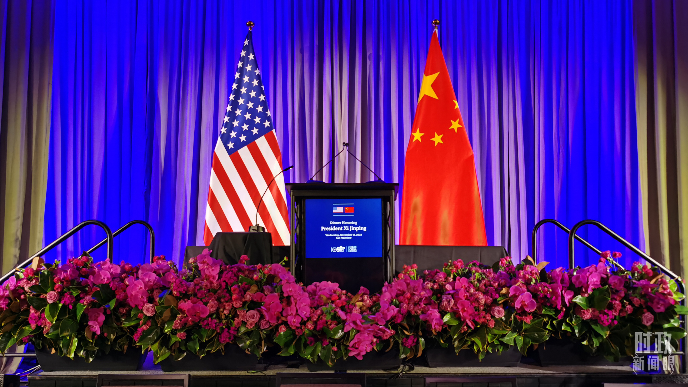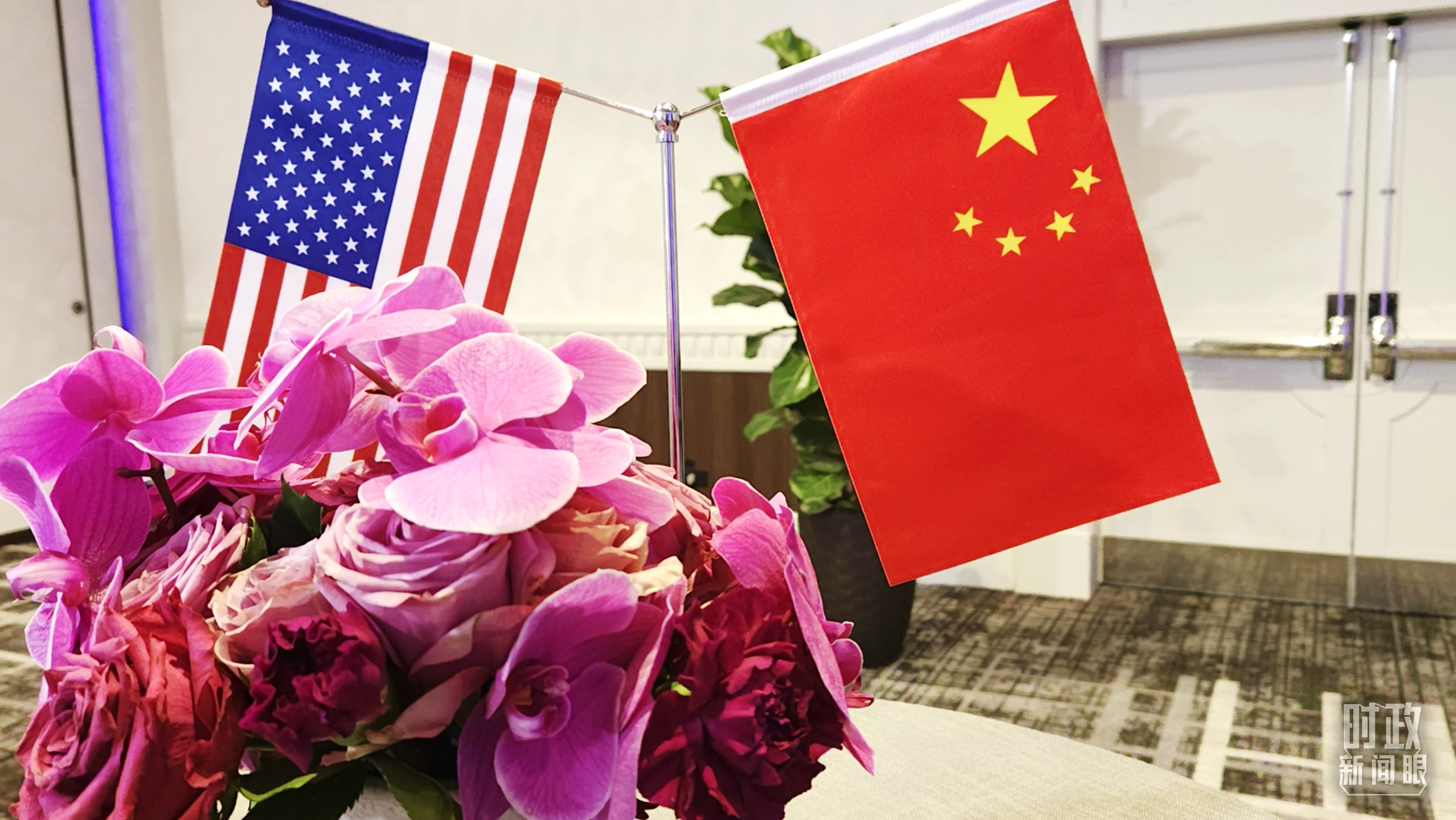△中美元首会晤合影厅的两国国旗。(总台央视记者杨波拍摄)