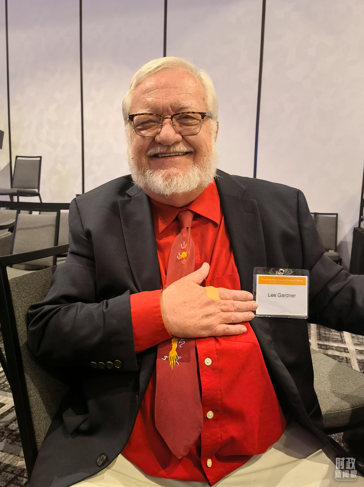 △年逾70岁的李·加德纳,是“鼓岭故事”主人公密尔顿·加德纳的侄孙。当天他特意佩戴了一条绣有“中国龙”的领带。(总台央视记者石丞、国广记者李晋拍摄)