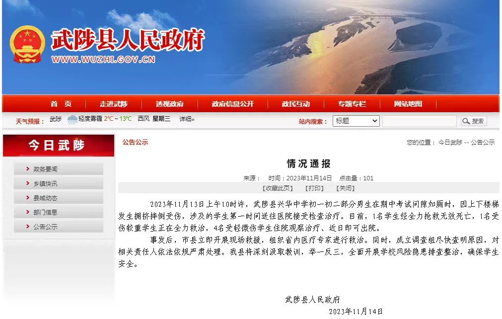 2023年11月14日晚,河南武陟县人民政府就一中学踩踏发布情况通报。