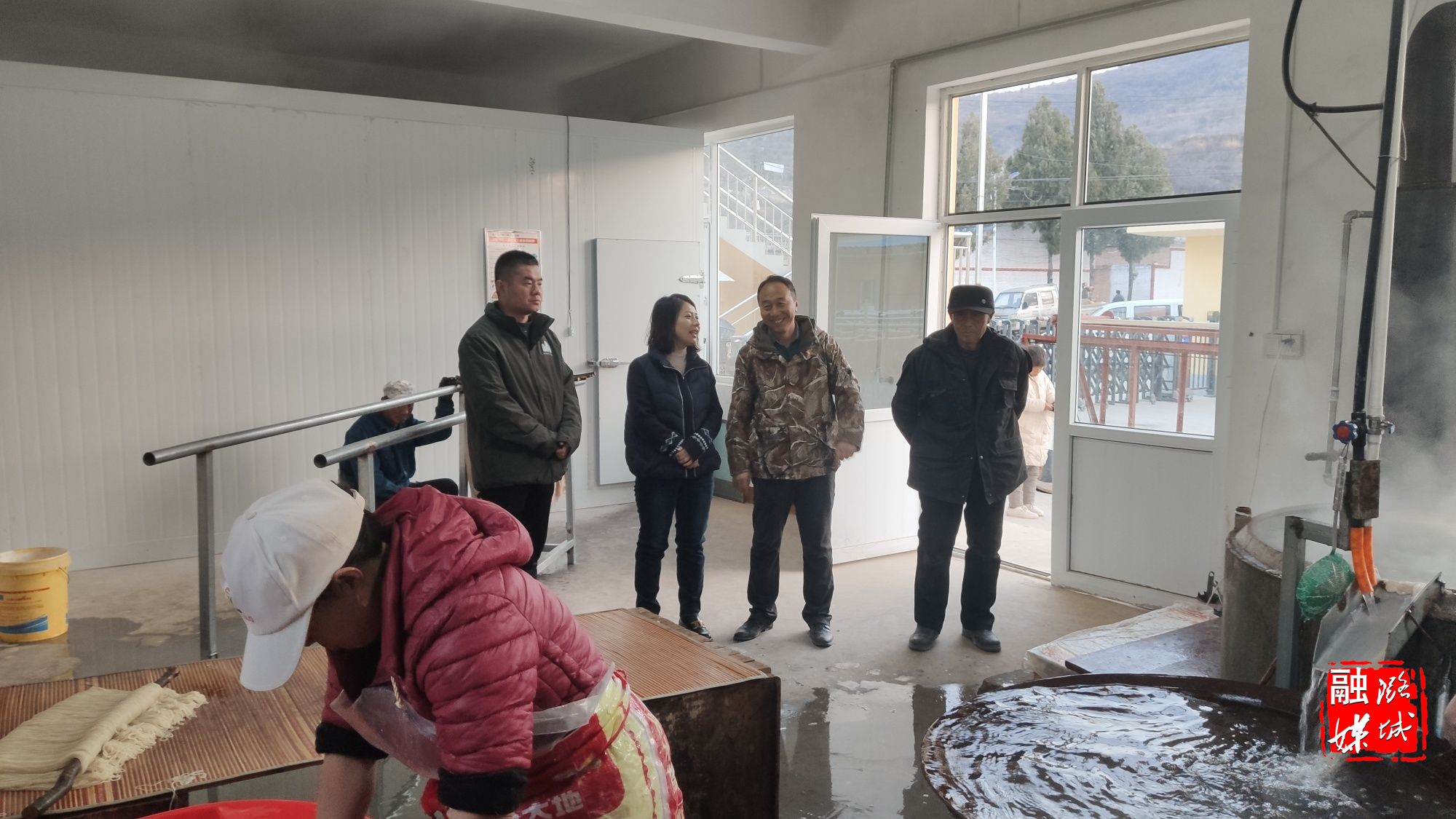 ★12月3日,辛安泉镇负责人在古城村红薯产业园查看红薯粉条加工情况。