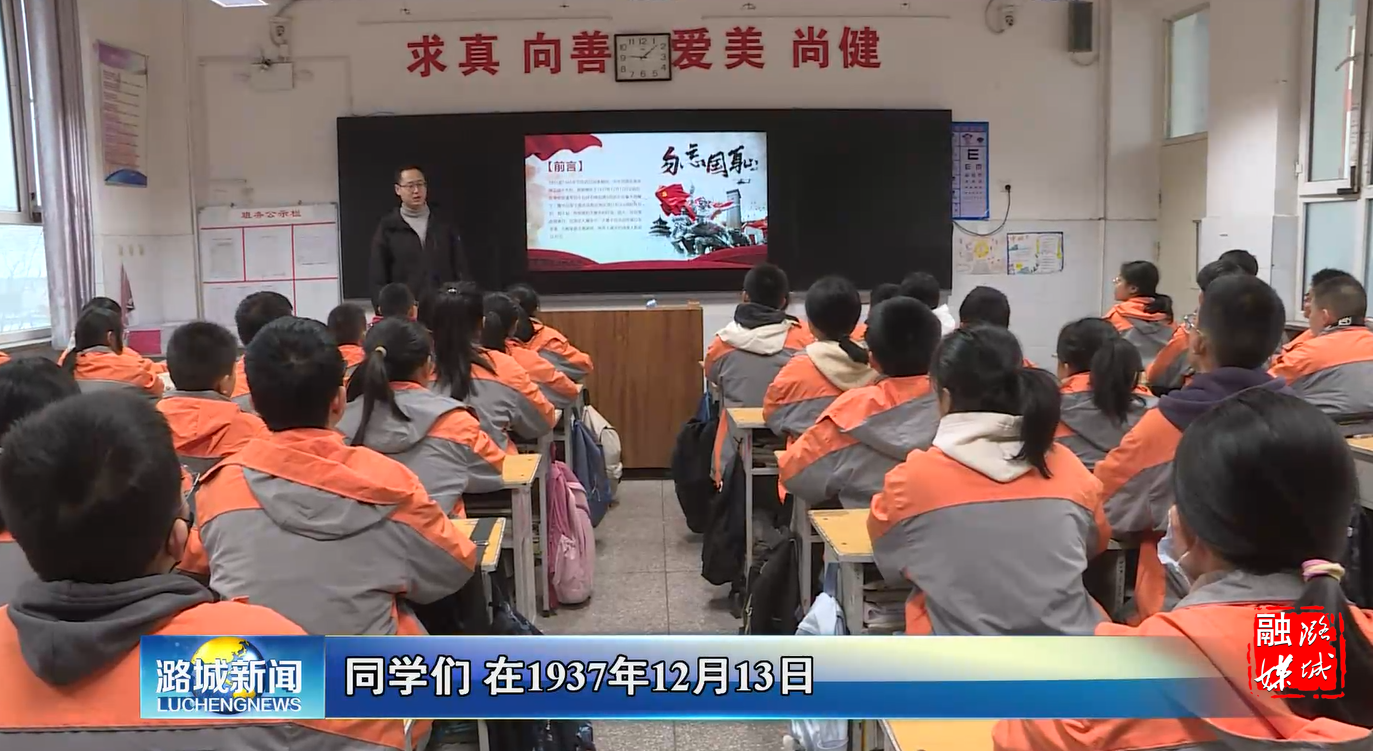 今年12月13日是第十个南京大屠杀死难者国家公祭日。当天,潞城三中开展了“勿忘国殇 吾辈自强”主题班会,让学生勿忘国耻、铭记历史,进一步弘扬民族精神,增强学生爱国主义情怀。