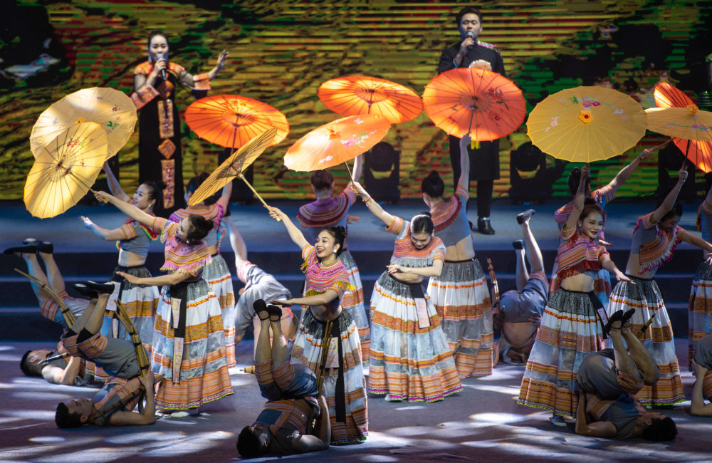 2023年1月18日,以“同心筑厚谊 携手共发展”为主题的2023年中越跨国春节联欢晚会在云南省红河哈尼族彝族自治州河口瑶族自治县举行,越南老街省民族艺术歌舞团的演员在晚会上表演歌舞《漂浮在云端的节日》。 新华社记者胡超 摄