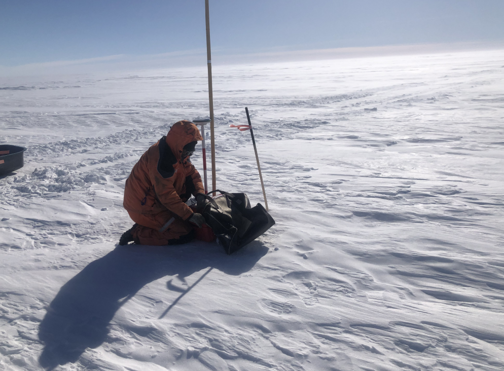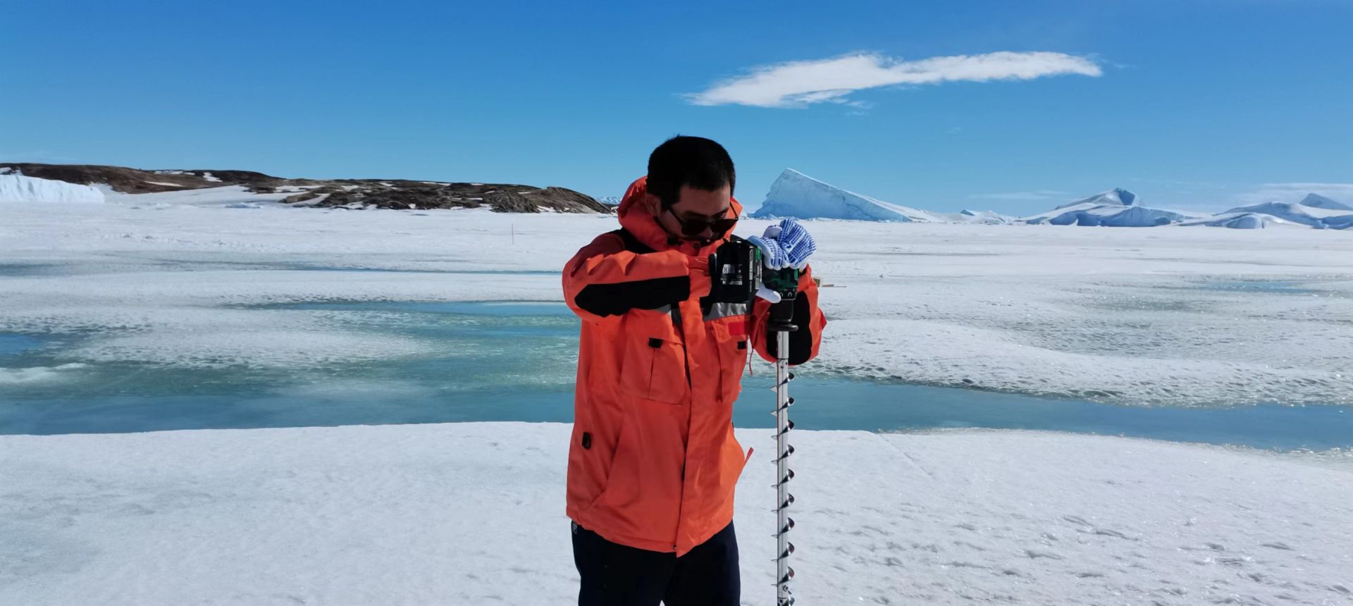 (▲中国第37次南极科学考察队队员麻源源正在进行冰面打孔,测量冰厚度)
