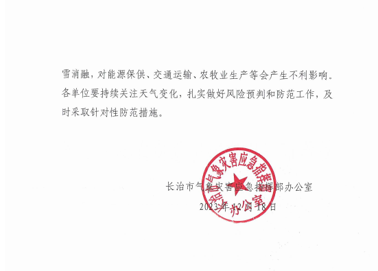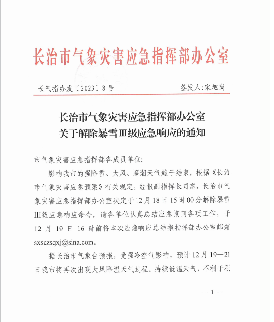 长治市气象灾害应急指挥办公室关于接触暴雪III级应急响应的通知