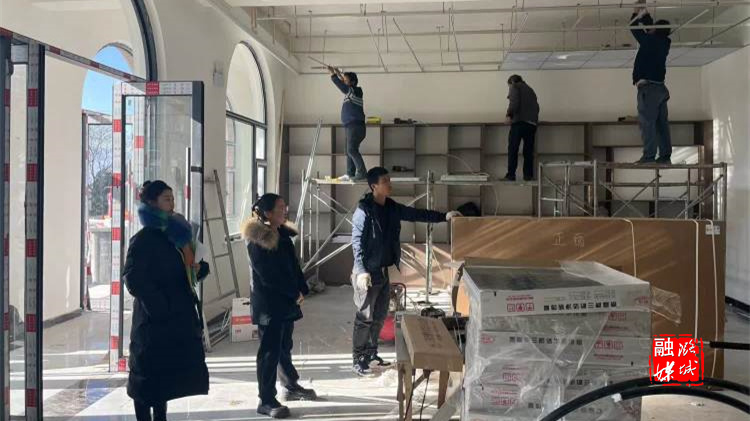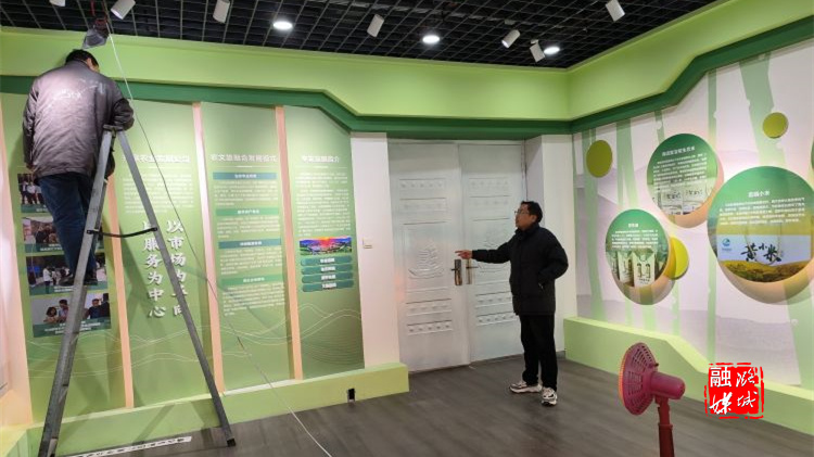 ▲辛安泉镇相关负责人在石梁村实地查看农产品展厅及直播间布置情况。