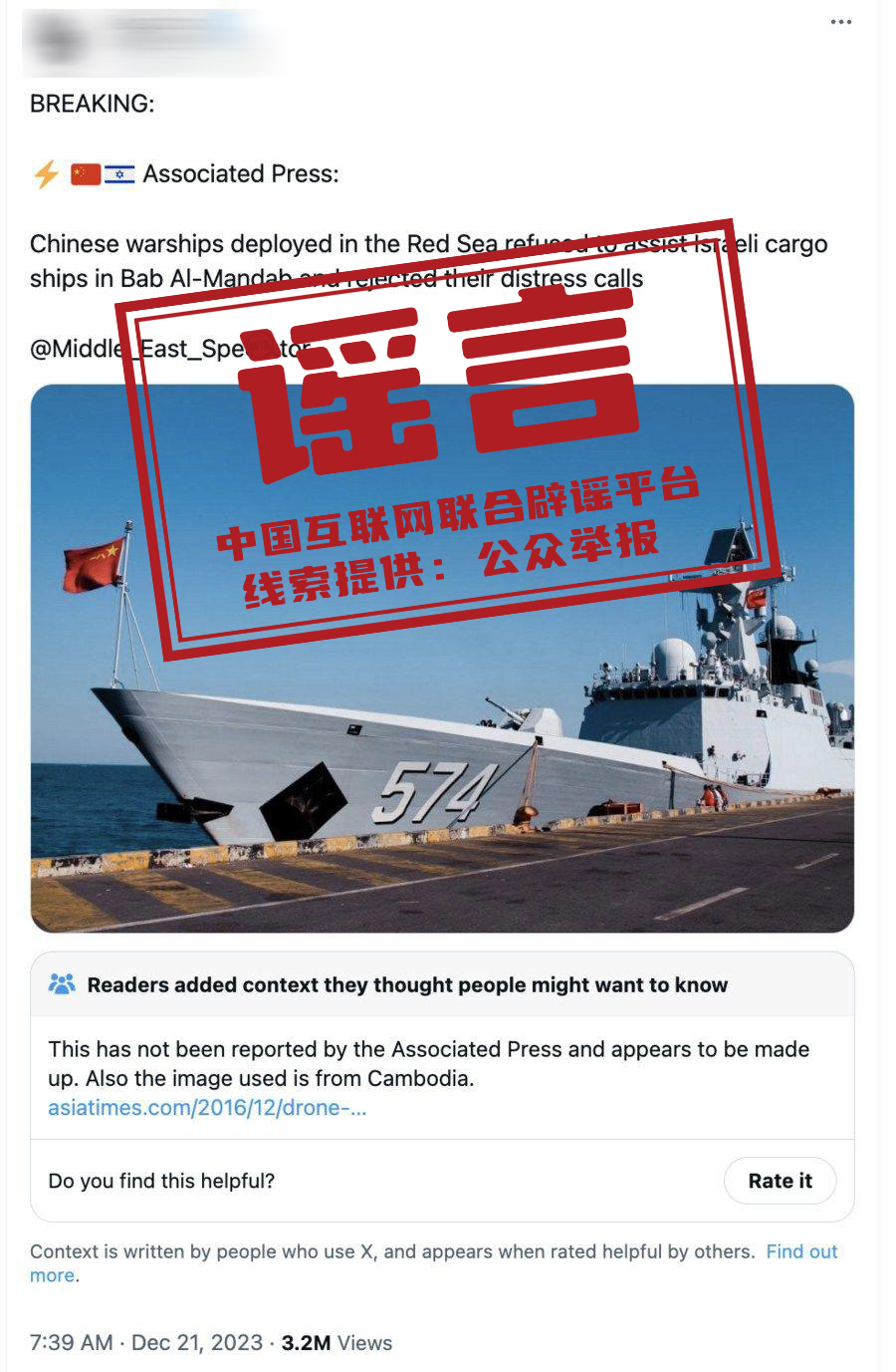 真相:针对“一艘以色列商船向中国海军乌鲁木齐舰进行求助遭到拒绝”的报道,国防部新闻发言人吴谦在12月28日的例行记者会上回应,这是彻头彻尾的假消息。另据新华社25日报道,一个有十多万“粉丝”的境外社交平台账号以美联社为“信源”发帖称,“中国军舰在曼德海峡拒绝协助以色列货船,且无视他们的呼救。”这一谣言随即被多个权威信源辟谣。事实上,美联社根本没有这则报道。(来源:中华人民共和国国防部、新华社)