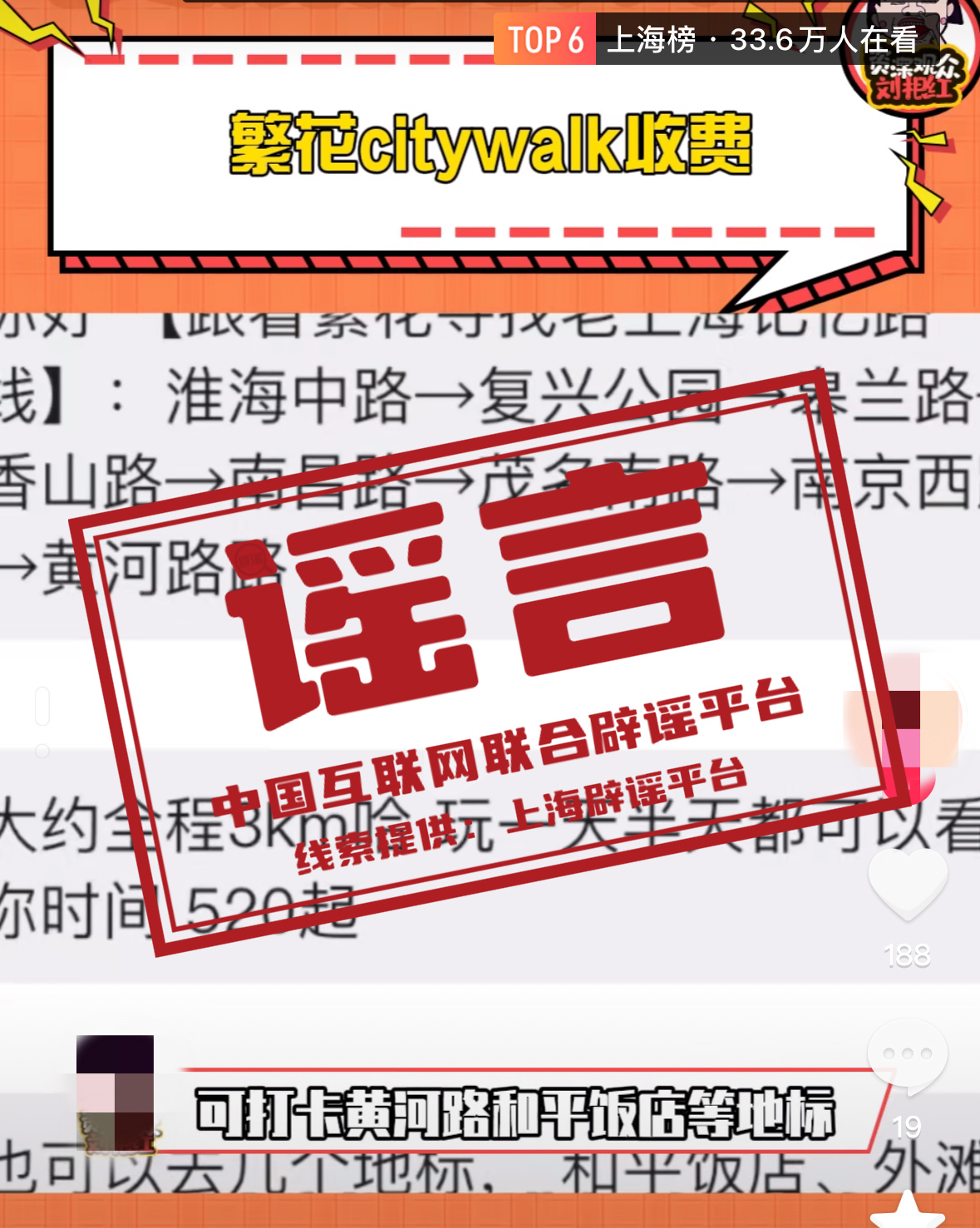 真相:近日,一则“繁花Citywalk(城市散步)收费3公里520元”的话题登上某社交平台热榜。上海辟谣平台调查发现,这一消息并不属实。在该社交平台热榜上的短视频中,主播们大多根据同一张经过裁剪、没头没尾的图片进行点评,并声称3公里收费520元太贵。但这些主播并没有介绍图片的来源和相关服务的提供者。