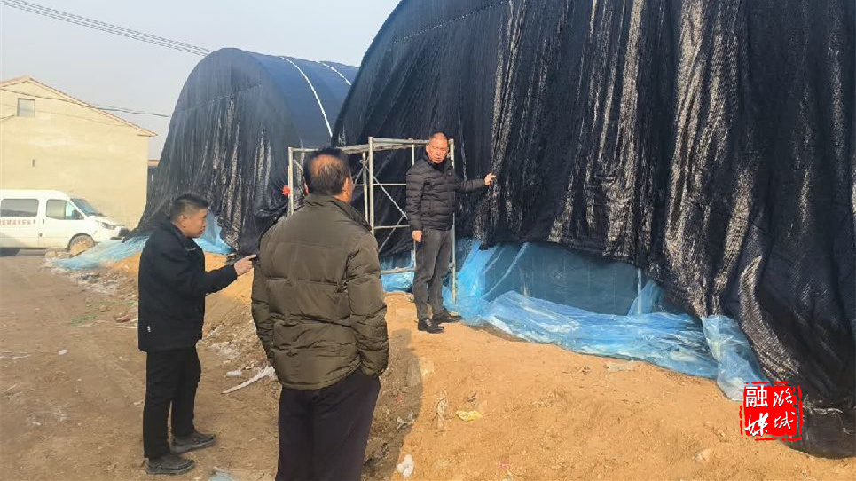 ▲微子镇工作人员在东靳村了解香菇大棚建设情况。