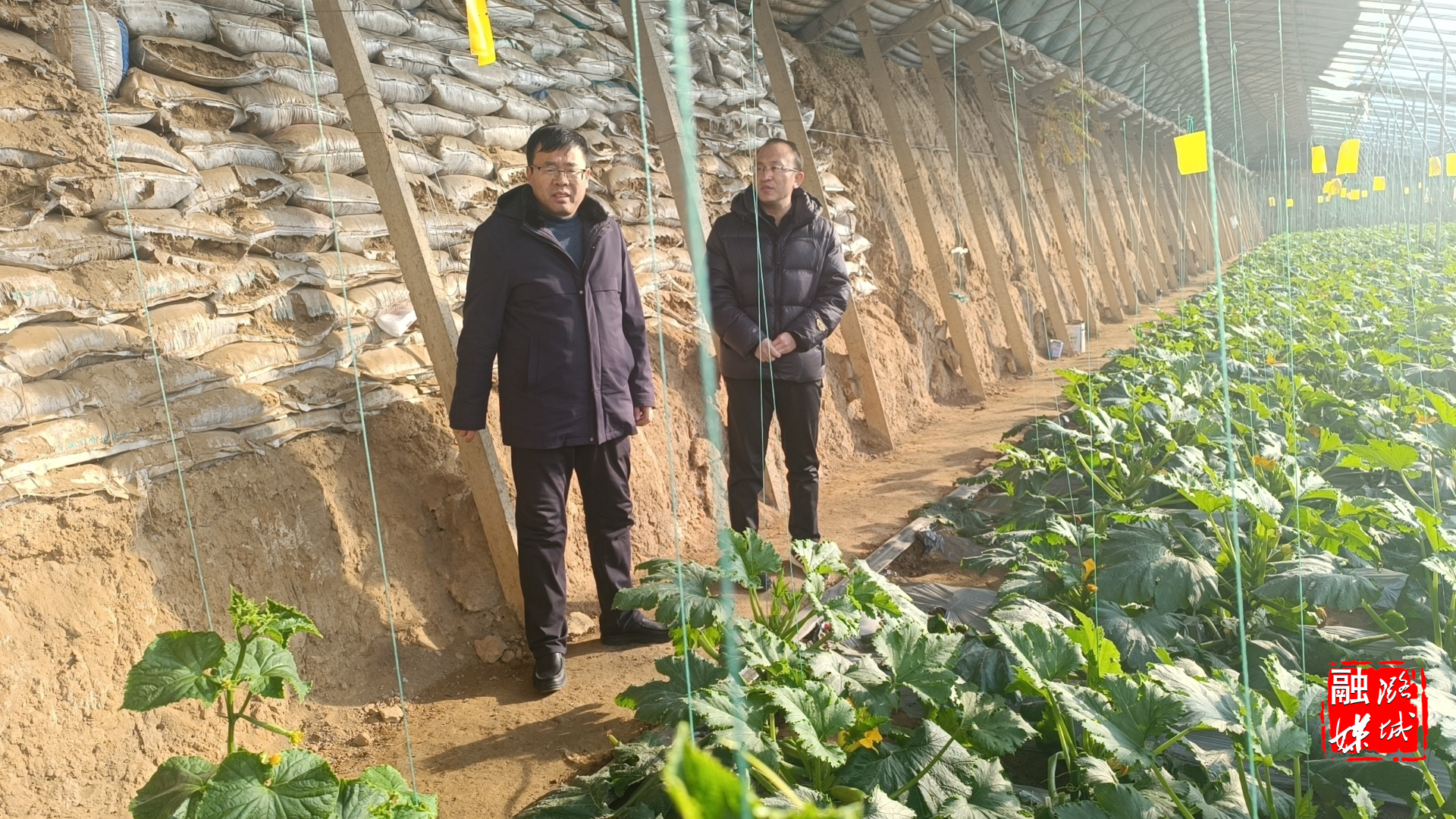▲辛安泉镇相关负责人在西流北村查看低温天气大棚设施管理情况。