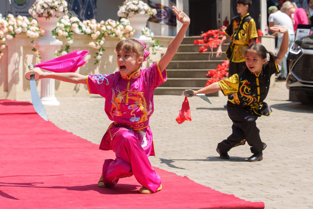 2023年5月27日,小演员在乌兹别克斯坦首都塔什干的中央公园表演武术。