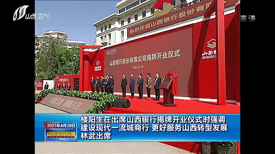 4月28日,山西银行股份有限公司揭牌开业仪式在太原举行。省委书记楼阳生出席并讲话。他强调,要深入贯彻落实习近平总书记关于金融工作的重要论述和视察山西重要讲话重要指示,敢于担当、勇于作为,志存高远、对标先进,把山西银行建设成为现代一流金融企业,为转型发展蹚新路作出新的更大贡献。省委副书记、省长林武,省委常委、秘书长李凤岐出席。副省长王一新主持。