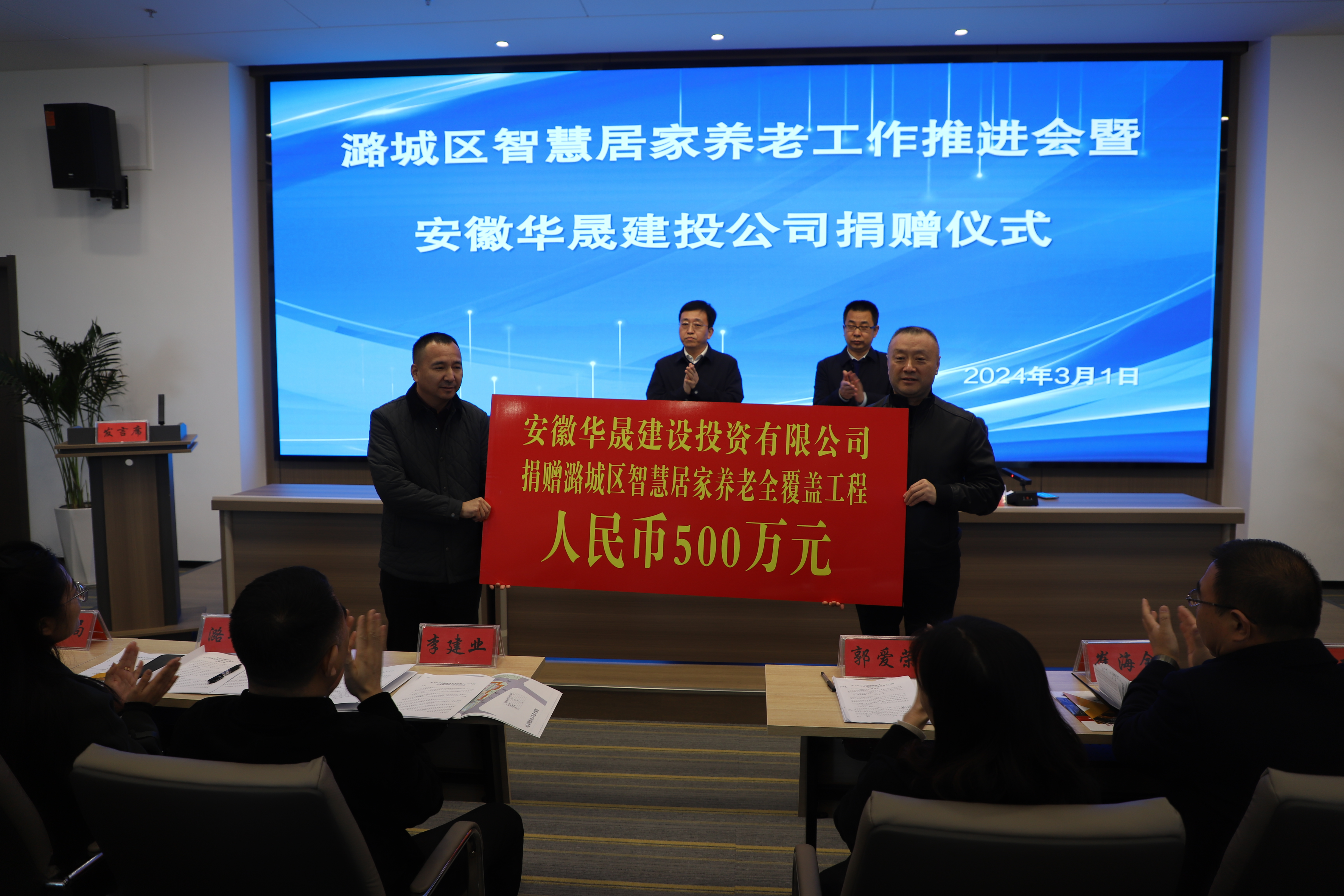 3月1日,我区举行智慧居家养老工作推进会暨安徽华晟建设投资有限公司捐赠仪式。区委书记段尧刚出席会议并讲话。副区长张永刚,安徽华晟建设投资有限公司董事长张守勇出席会议。相关区直部门负责人,各社区和社区卫生服务站及各敬老院负责人参加会议。