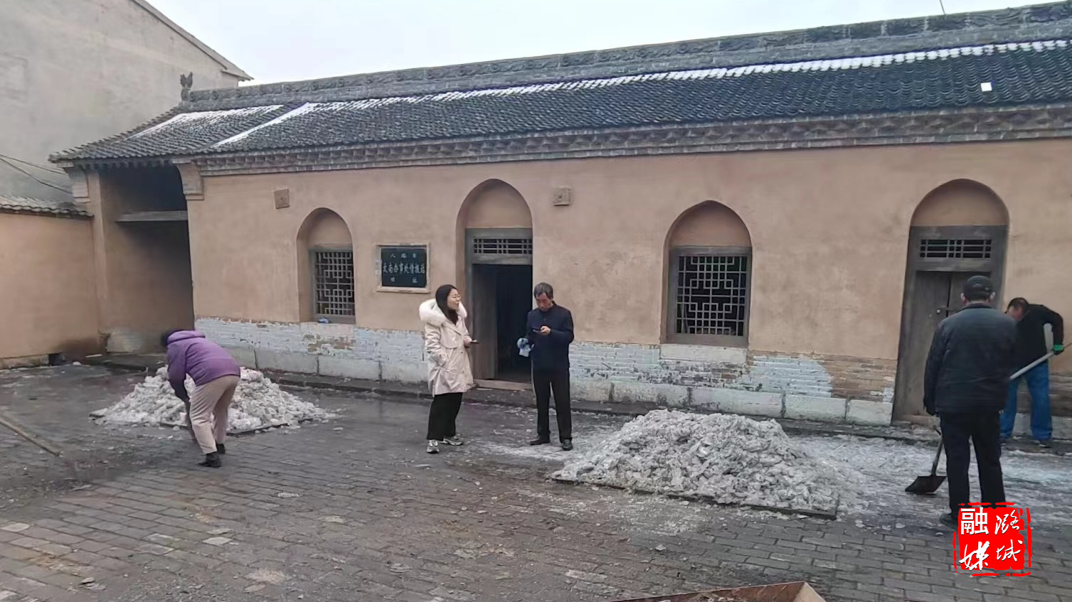 ▲成家川街道相关负责人在台东村情报纪念馆协调文旅项目建设事宜。