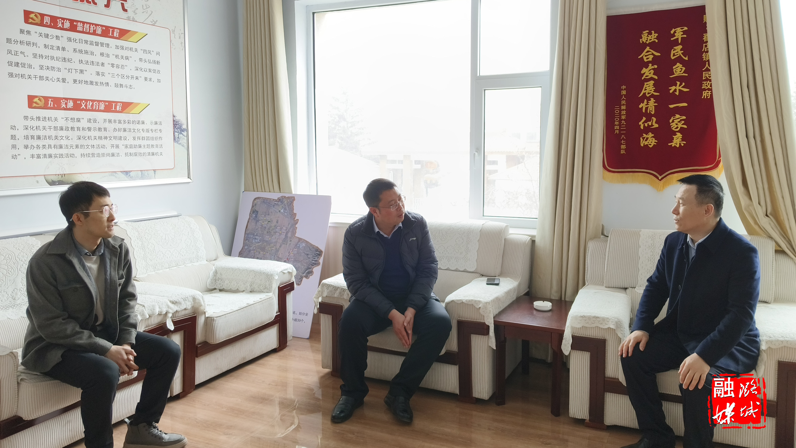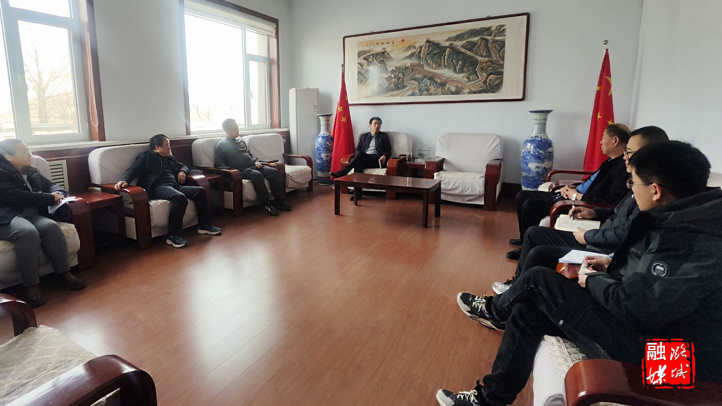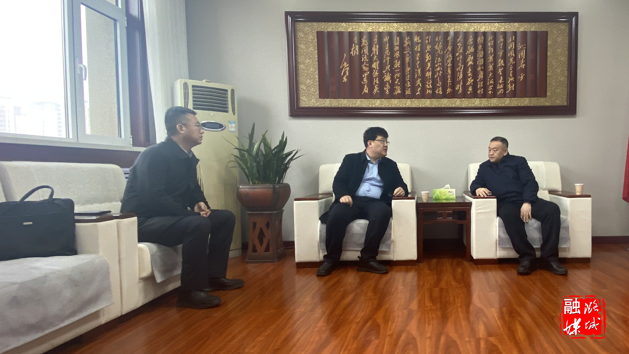 ▲翟店街道负责人与到访客商洽谈项目合作事宜,积极推进街道项目建设工作。