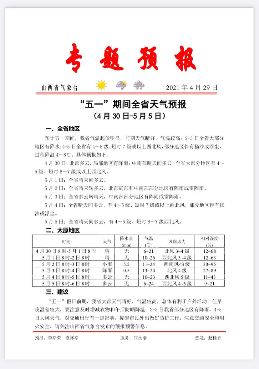 预计五一期间,山西省气温起伏明显,前期天气晴好,气温较高:2-3日全省大部分地区有降水:4-5日全省有4~5级、短时7级或以上西北风,部分地区伴有扬沙或浮尘,过程降温4~8℃.具体预报如下: