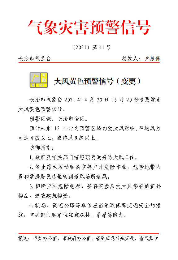 长治市气象台2021年4月30日15时20分变更发布大风黄色预警信号