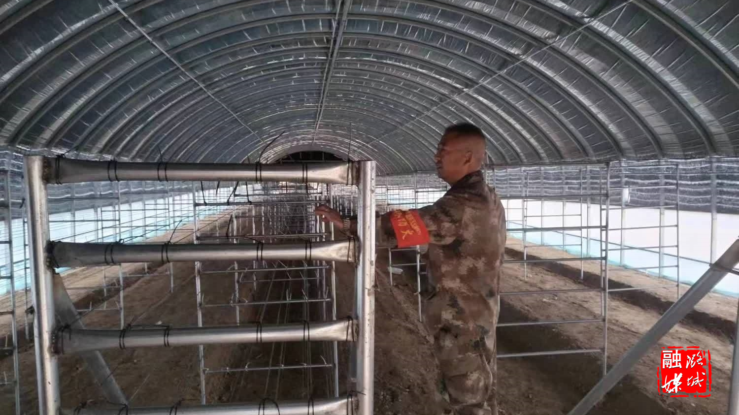 ▲微子镇相关负责人在东靳村查看香菇大棚建设进度。