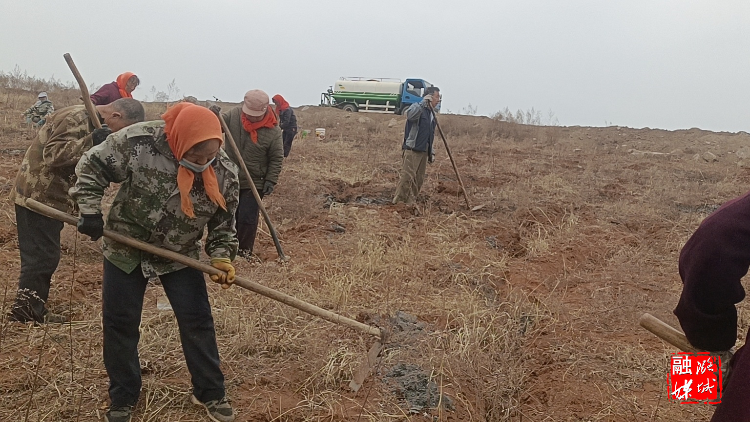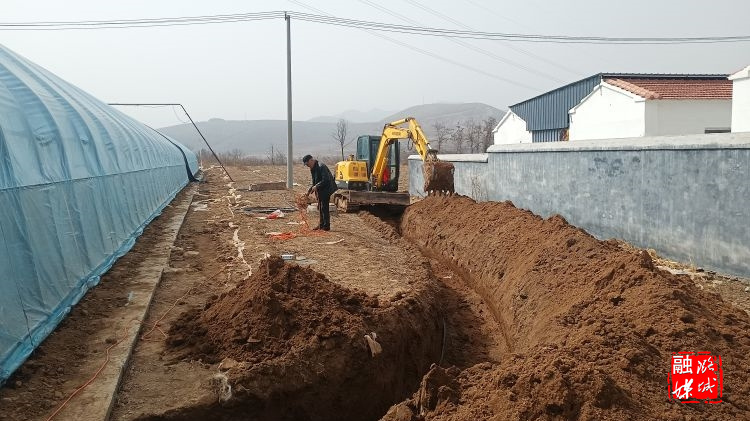 ▲成家川街道神泉村育苗棚灌溉池开展防水施工,提高育苗成活率。