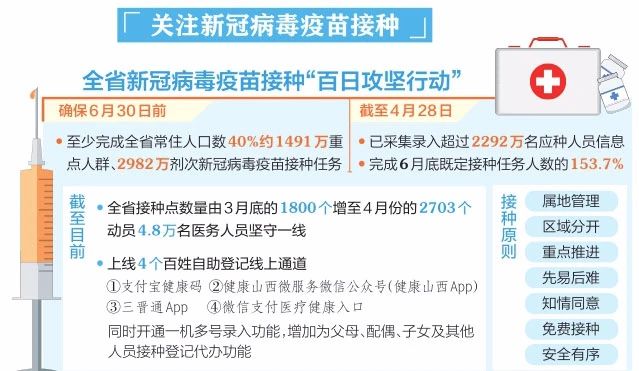 记者采访中了解到,我省依托云时代开发上线了支付宝健康码、健康山西微服务微信公众号(健康山西App)、三晋通App、微信支付医疗健康入口等4个百姓自助登记线上通道,连同山西省免疫规划信息系统实现了多渠道登记个人信息,减轻接种现场压力。同时针对部分群众智能手机录入困难问题,开通一机多号录入功能,增加为父母、配偶、子女及其他人员接种登记代办功能,为实现全人群快速接种登记提供了灵活有效的解决方案。截至4月28日已采集录入超过2292万名应种人员信息,完成6月底既定接种任务人数的153.7%。