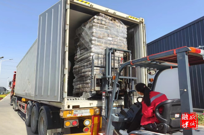 “滴——滴——滴”在产业园西北角一间仓库旁,工人师傅以十分熟练的操作,驾驶叉车将已打包好的上万袋菌棒依次装入一辆集装箱货车。