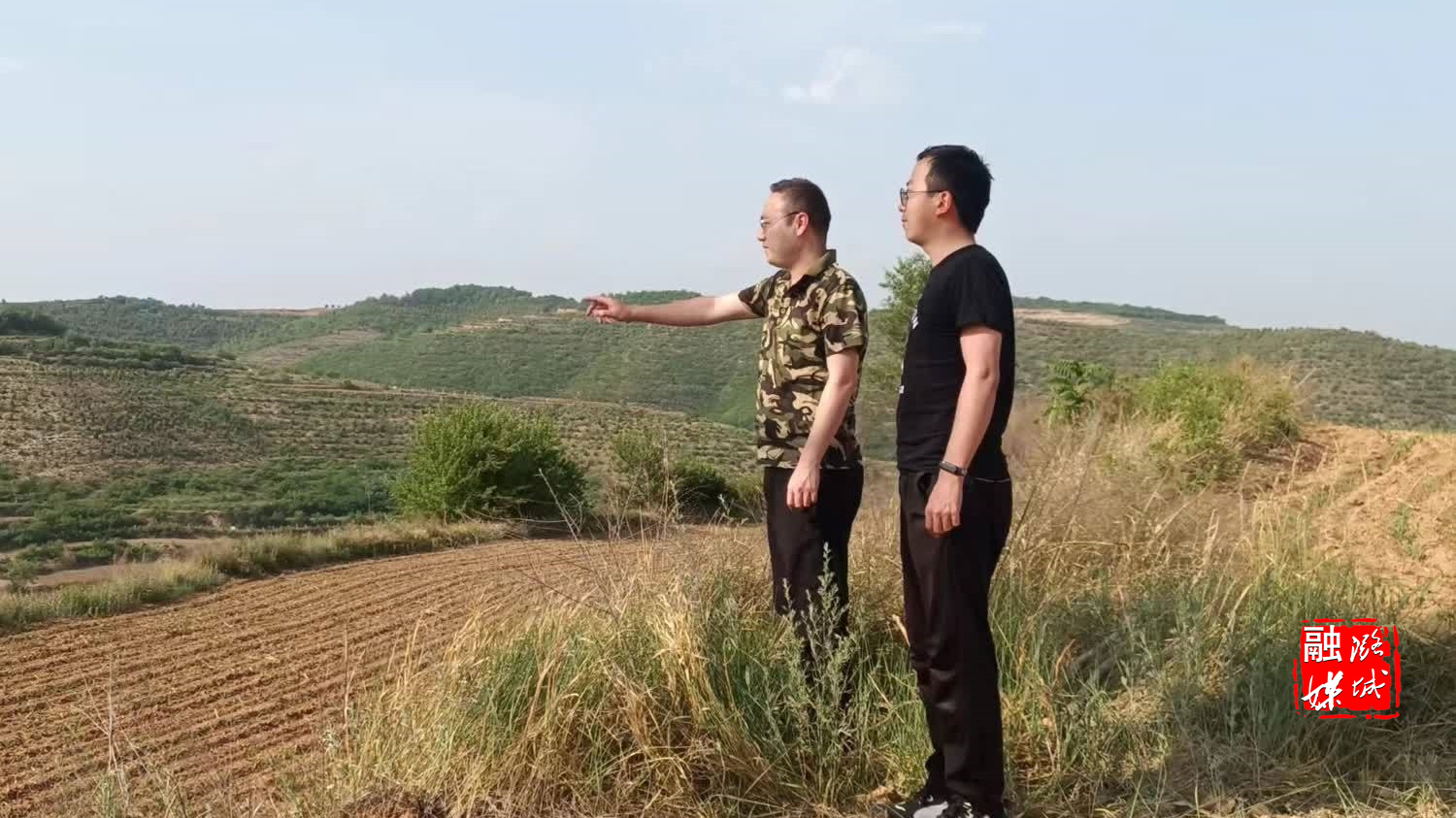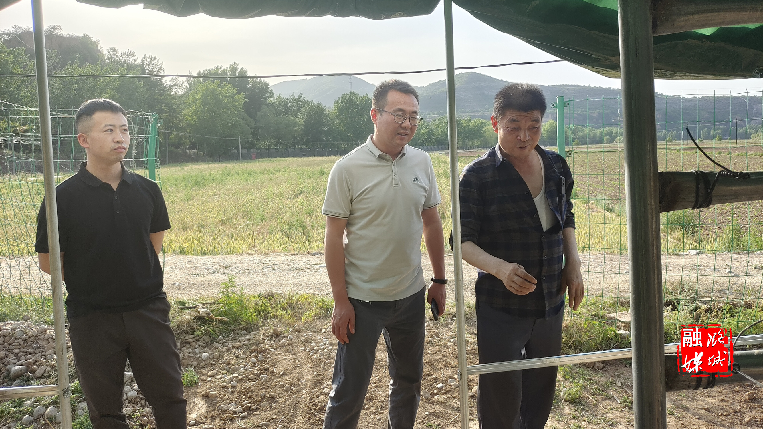 ★5月19日,黄牛蹄乡相关负责人在香菇种植基地查看大棚建设进度。