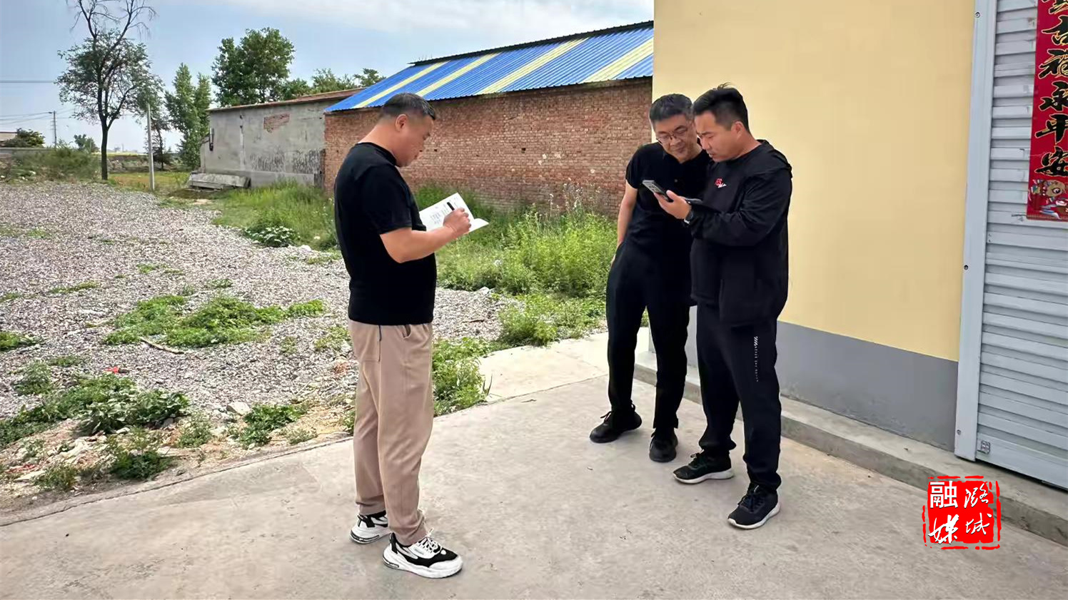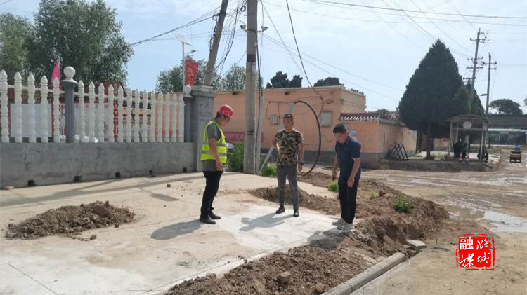 ▲微子镇工作人员在东靳村了解进村路和活动广场硬化情况。