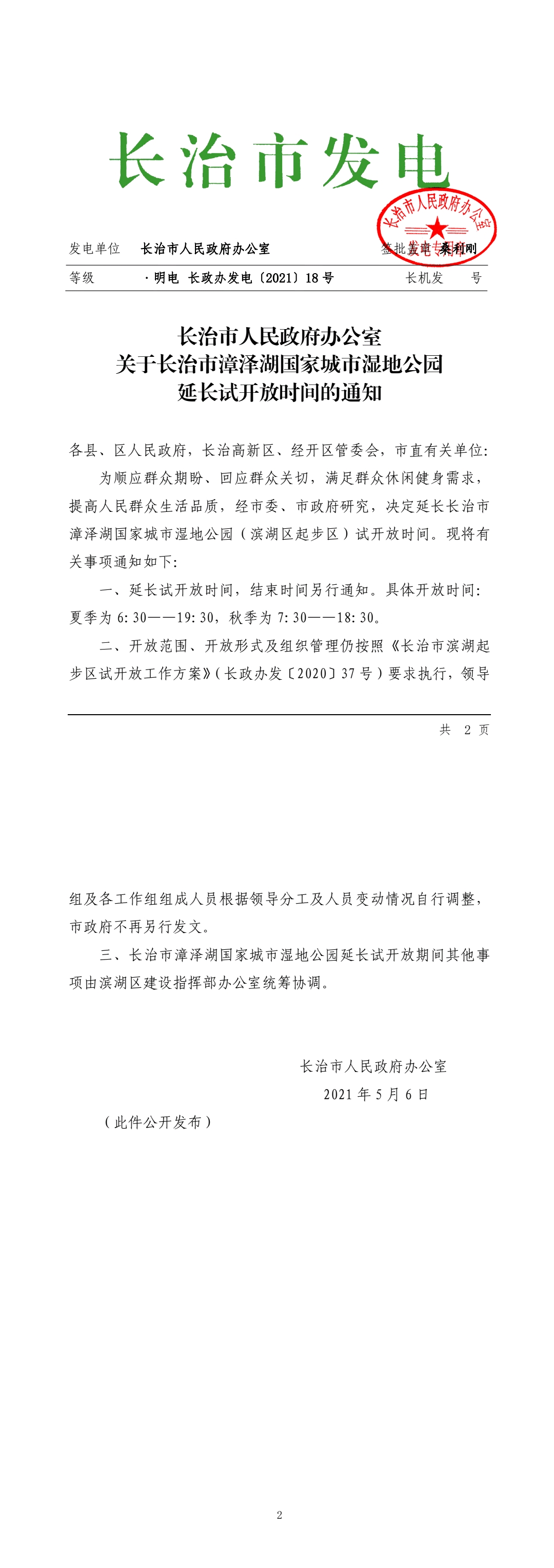 长治市人民政府办公室 关于长治市漳泽湖国家城市湿地公园 延长试开放时间的通知