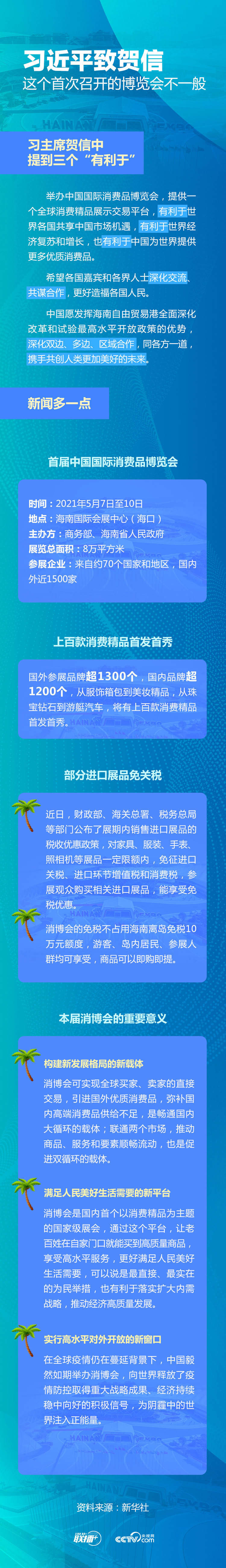 “中国愿发挥海南自由贸易港全面深化改革和试验最高水平开放政策的优势,深化双边、多边、区域合作,同各方一道,携手共创人类更加美好的未来。”5月6日,习近平主席向首届中国国际消费品博览会致贺信。