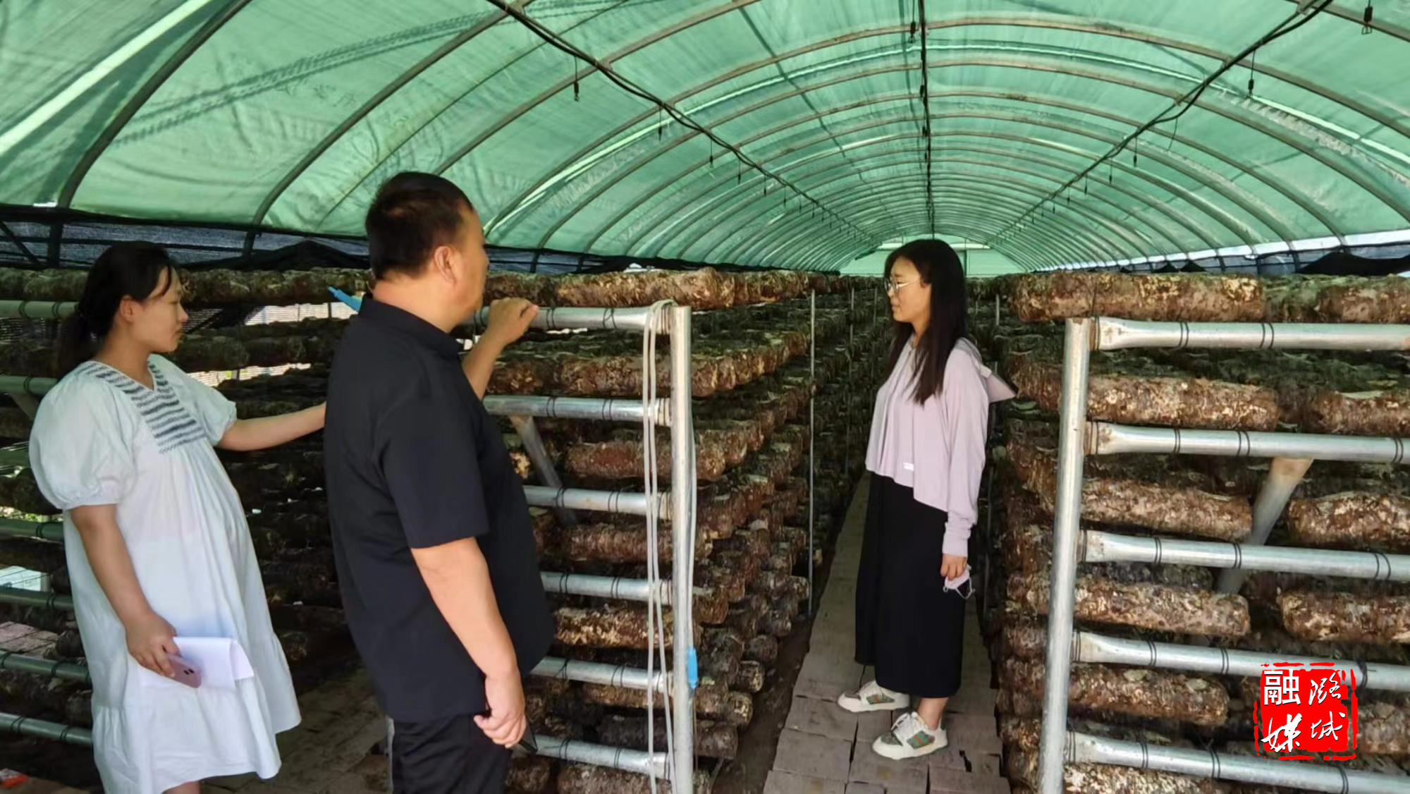 ▲成家川街道相关负责人在黄池村香菇大棚查看香菇长势。