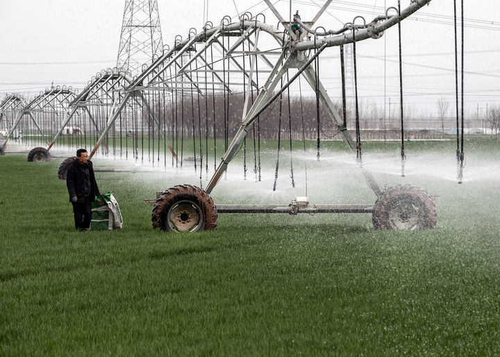 2024年3月18日,在河南省焦作市博爱县孝敬镇东原庄村瑞辉家庭农场,村民使用全自动指针式喷灌机进行浇灌作业。新华社发(程全摄)