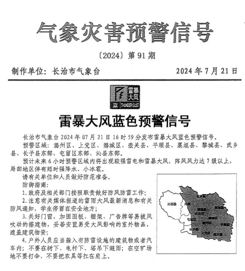 长治市气象台发布雷暴大风蓝色预警信号