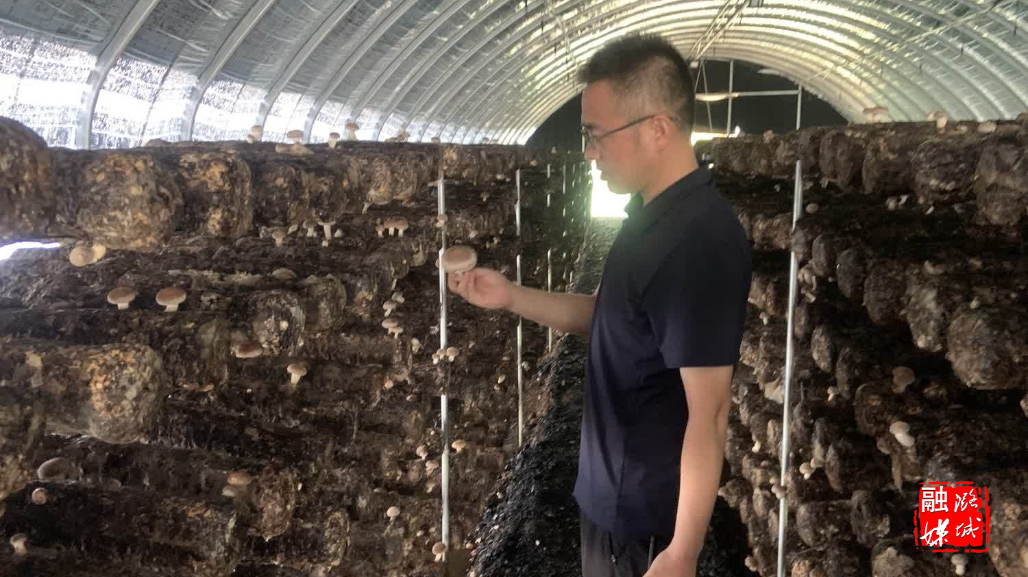 ▲微子镇负责人在东靳村香菇大棚查看香菇长势情况。
