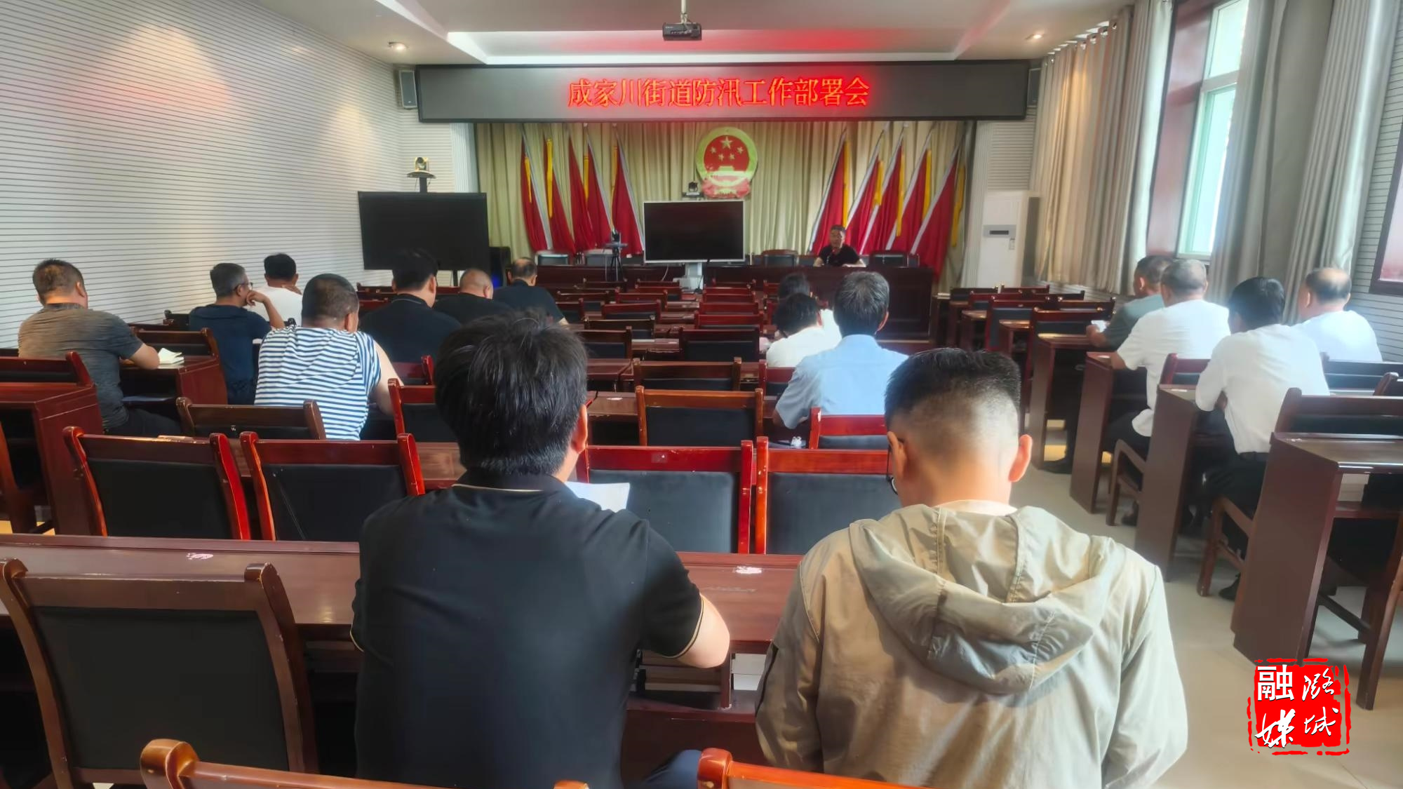 ▲成家川街道相关负责人主持召开防汛工作部署会。