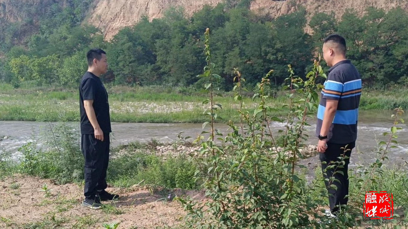 ▲辛安泉镇相关负责人在浊漳河沿线排查河道行洪安全隐患。